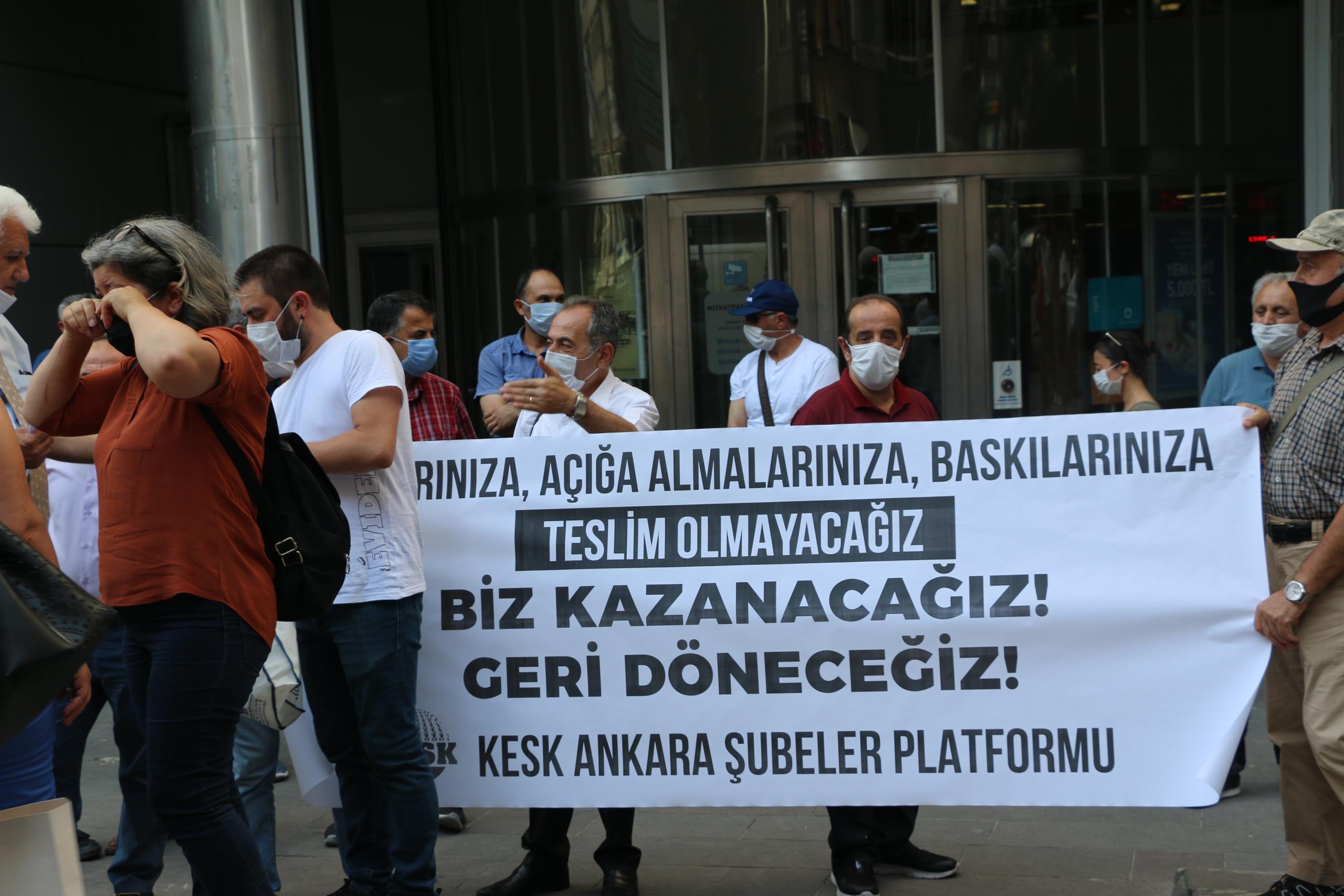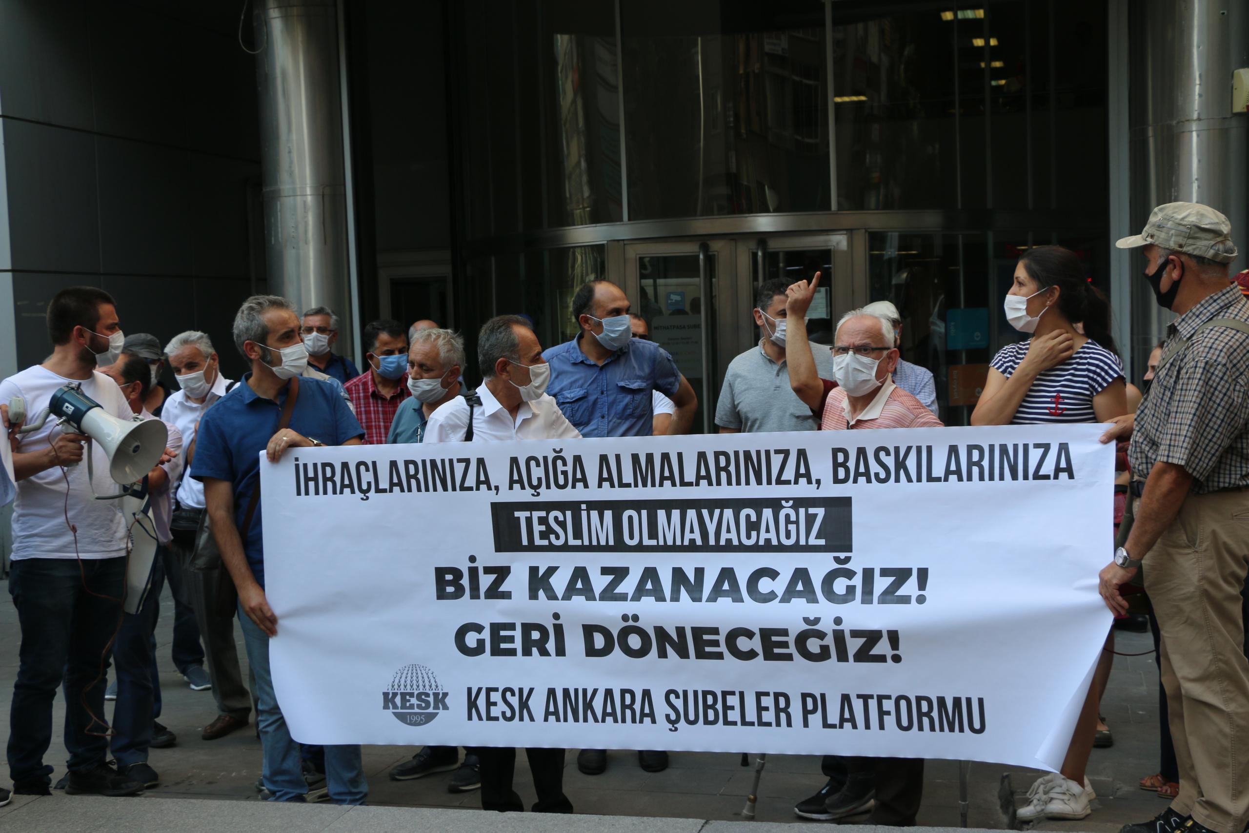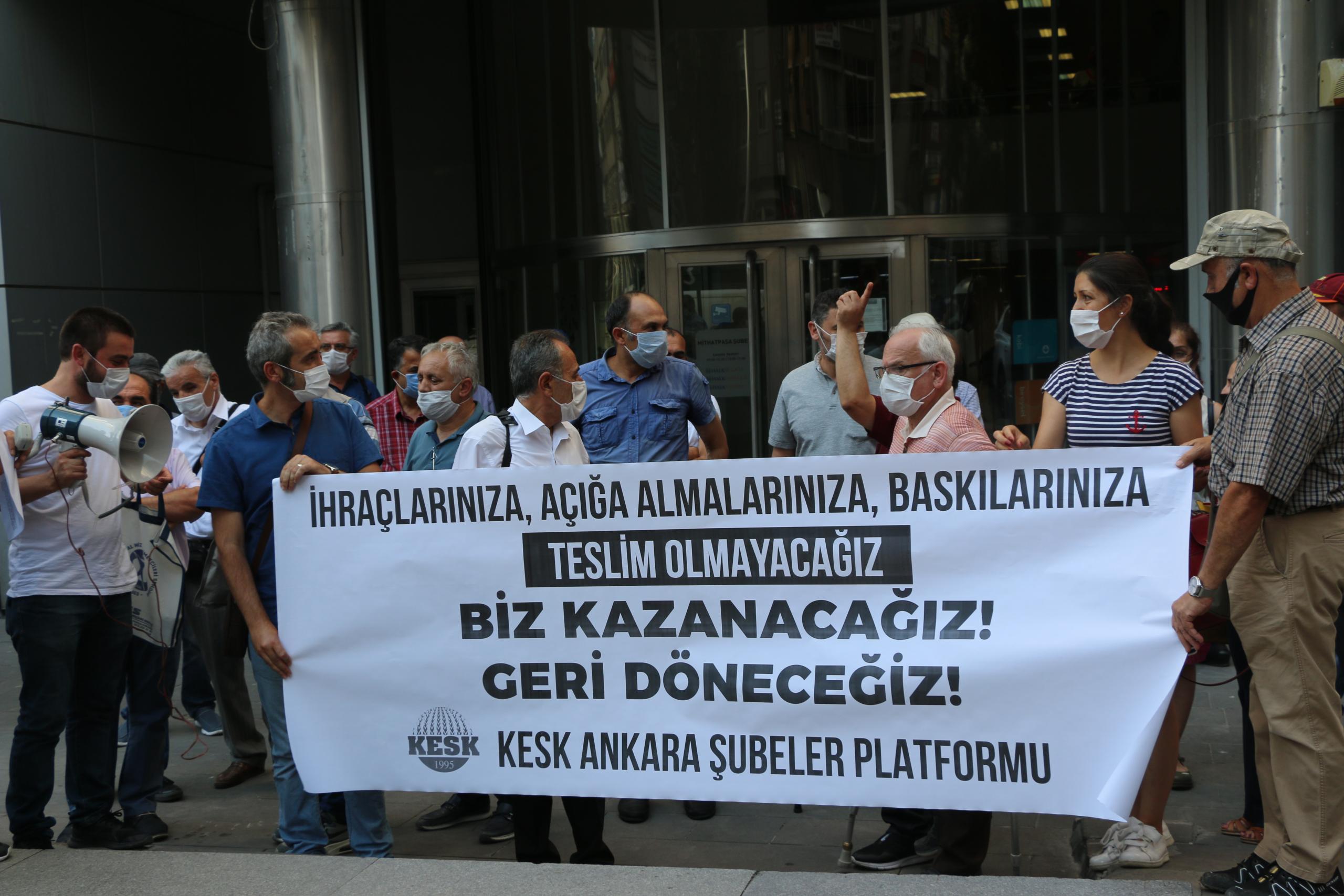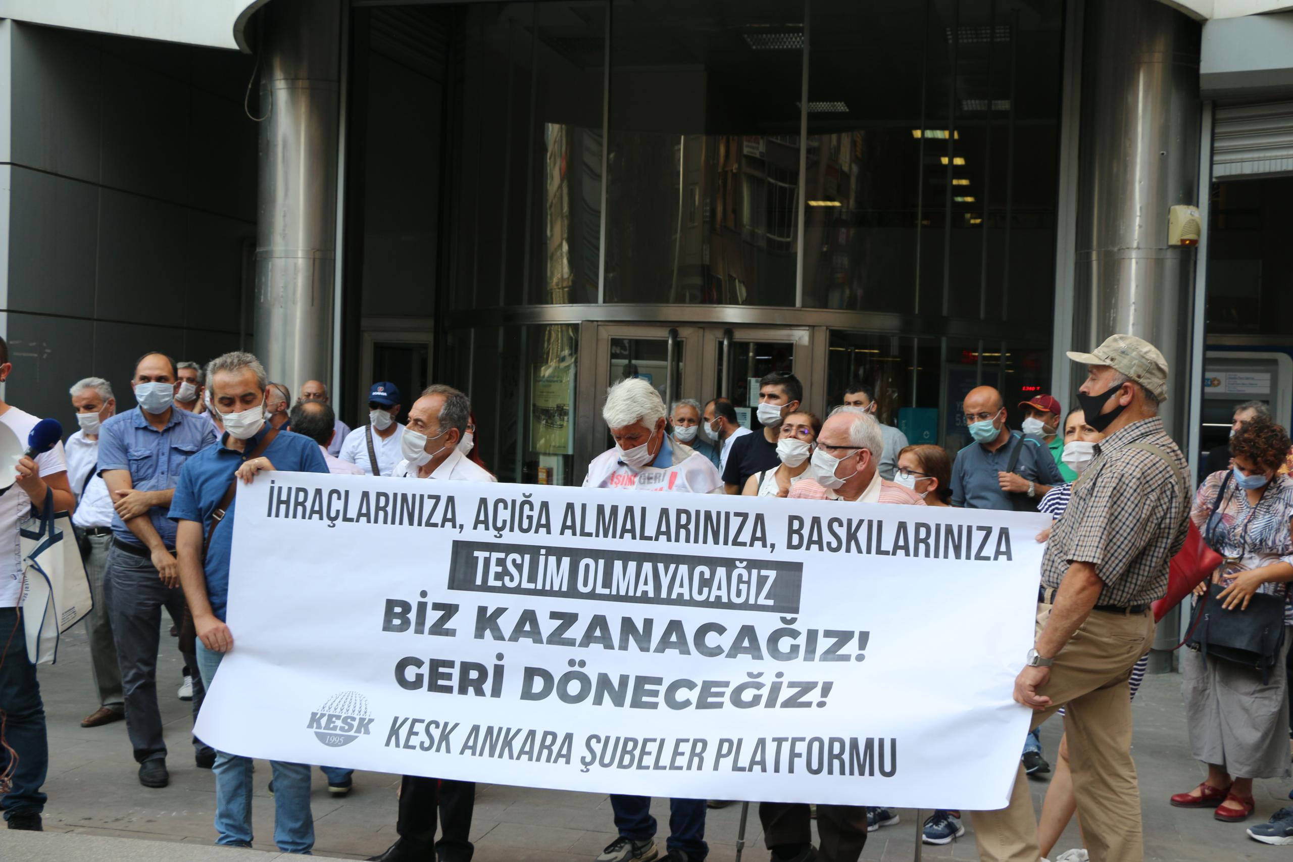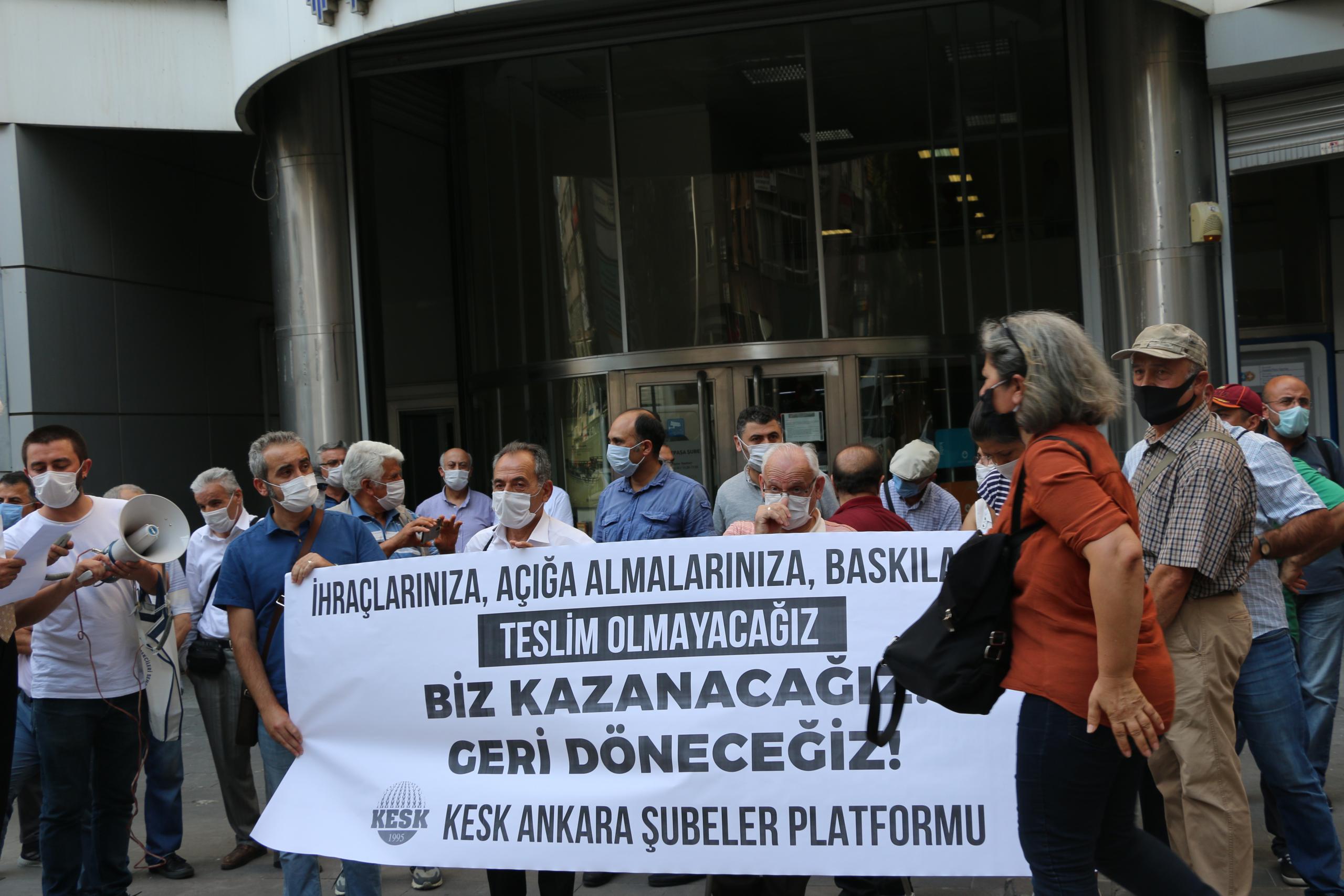 KESK Ankara Şubeler Platformu, hukuksuz ihraç edilen tüm kamu emekçileri görevlerine iade edilinceye, yaşatılan haksızlıkların, nefessiz bırakmayı, sosyal ölü haline getirmeyi amaçlayan politikaların hesabı verilinceye kadar mücadele etmeye devam edeceklerini vurguladı.