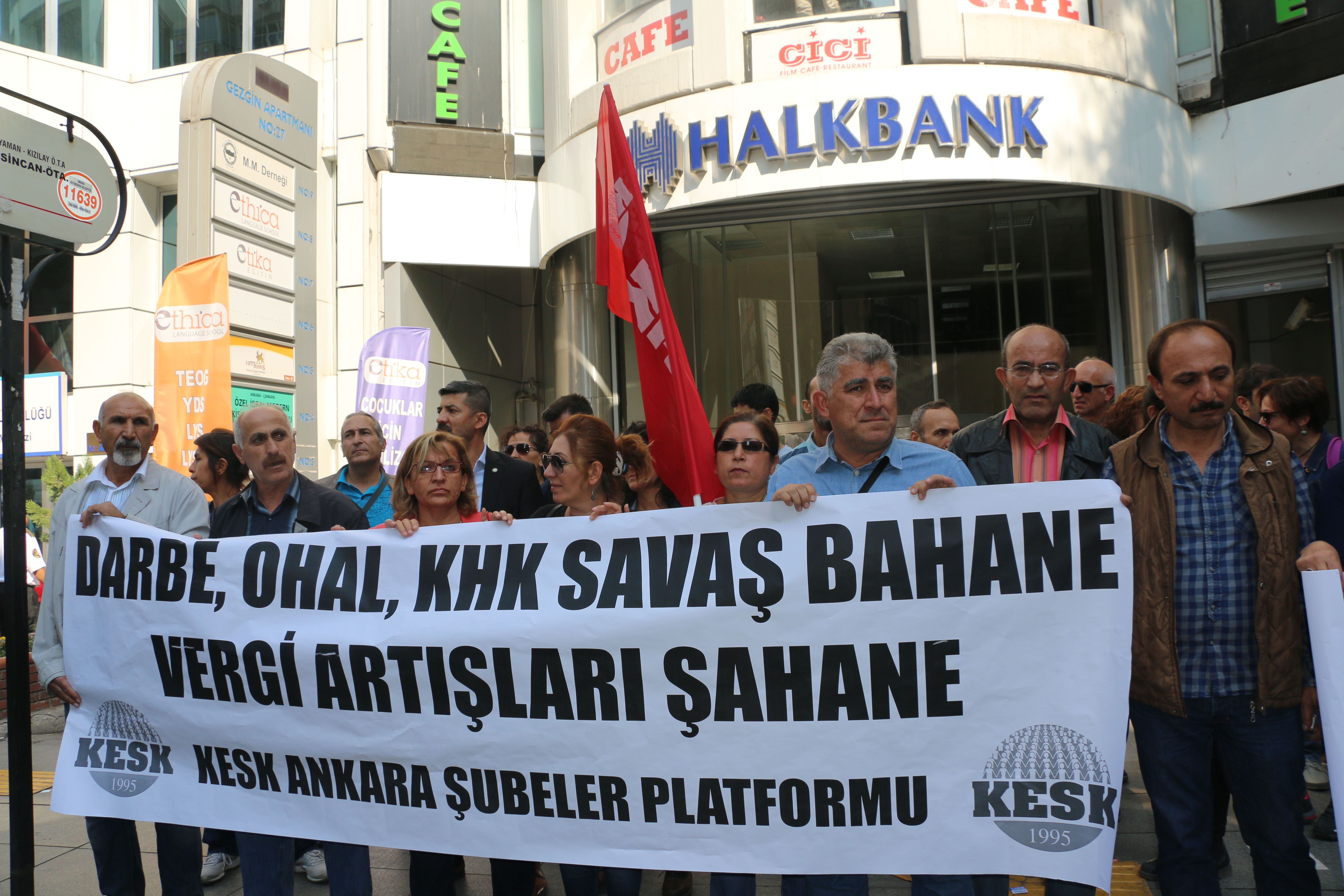 Sakarya Caddesinde 14.00 bir araya gelen KESK bağlı sendika üyelerinin toplandığı alana güvenlik güçlerince Ankara valiliğin yasağı gerekçe gösterilerek açıklamaya izin verilmedi. Bunun üzerine KESK’li emekçiler Mithat Paşa Caddesi üzerinde bulunan Eğitim Sen Üniversiteler 5 Nolu Şube’nin önünde bir araya gelinerek basın açıklaması yapıldı.