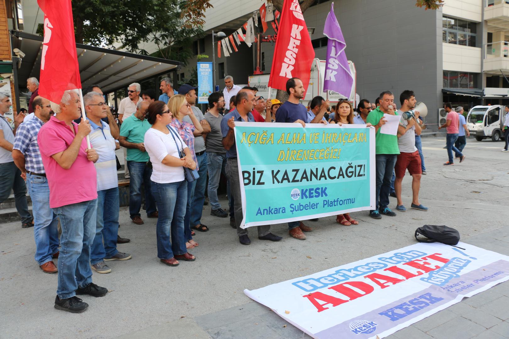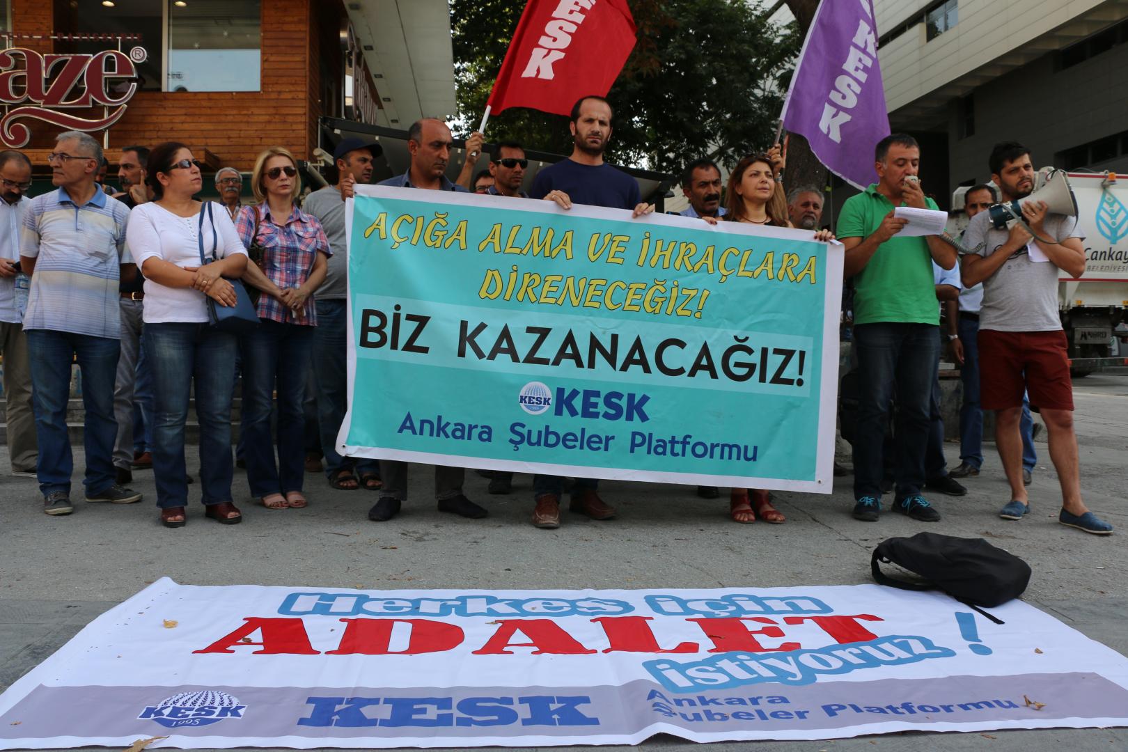 İhraçlar içerisinde 4 bin 9 kişinin KESK üyesi ve yöneticileri olduğunun belirtildiği açıklamada, “Bugün bir kez daha buradan sesleniyoruz, Anayasal bir hak olan çalışma hak ve özgürlüğü elinden alınan arkadaşlarımız derhal görevlerine iade edilmelidir. Emekten, barıştan, adaletten, eşitlikten, özgürlüklerden ve laik yaşamdan yana olan arkadaşlarımızın hukuksuz bir şekilde işten atılmalarının, açığa alınmalarının durdurulmasını hemen işlerine iadelerini istiyoruz” ifadeleri kullanıldı.