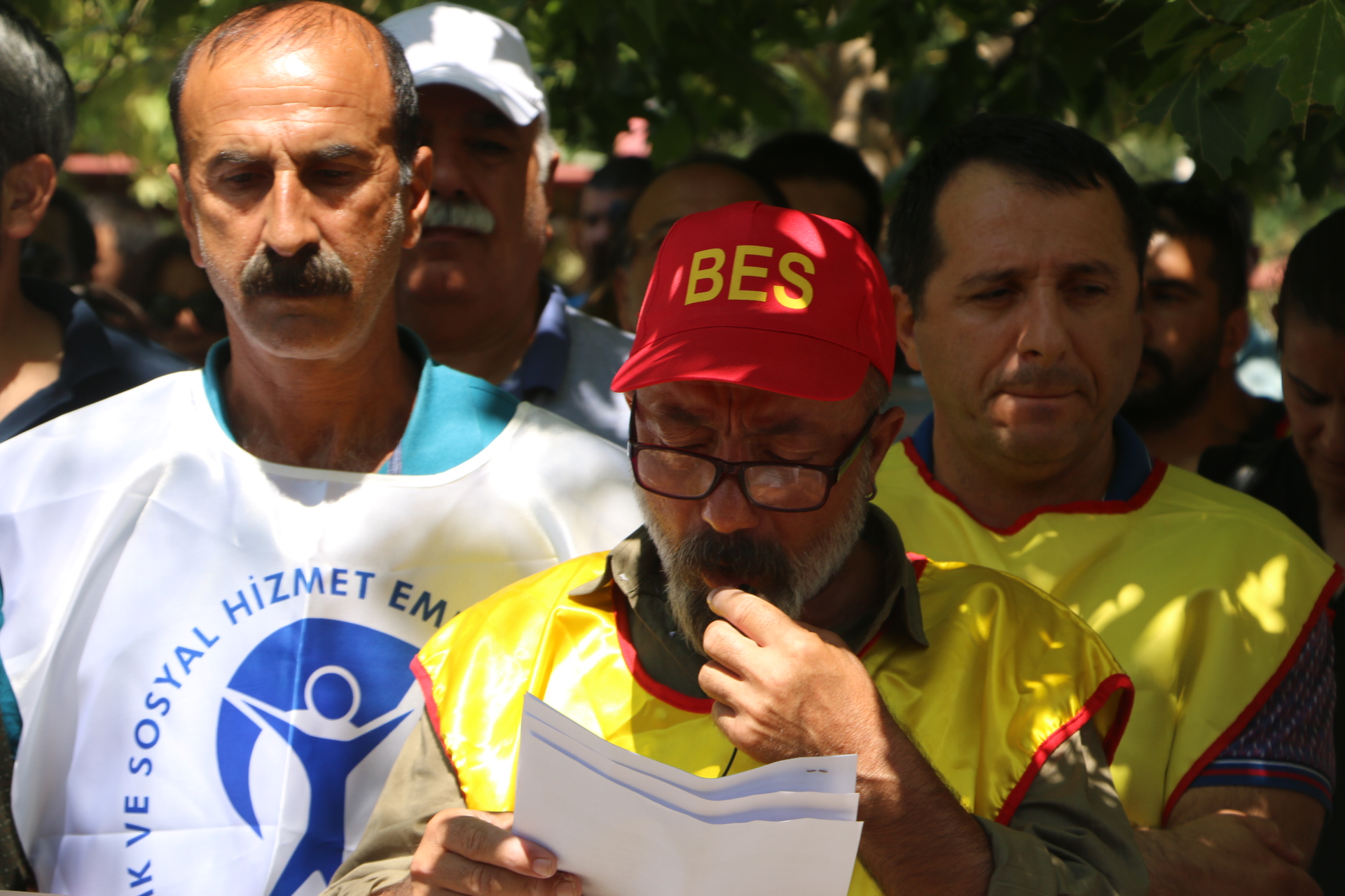 Açıklamayı okuyan Büro Emekçileri Sendikası Dersim Şube Başkanı Özcan Gürtaş, “Toplu sözleşmede 21 Ağustos itibari ile Kamu Görevlileri Hakem Kurulu süreci başlamıştır. Adı üzerinde taraflar arasında hakemlik görevi yapmak için görevlendirilen bir kurulun tarafsız olması şarttır. Ancak mevcut yasalara göre toplu sözleşmede taraf olan hükümet tarafsız olması gereken Hakem Kurulu üyelerinin çoğunluğunu belirlemektedir. Böyle bir Hakem Kurulu’ndan kamu emekçilerinin lehine bir karar çıkmasını beklemek çok zordur” ifadelerini kullandı.