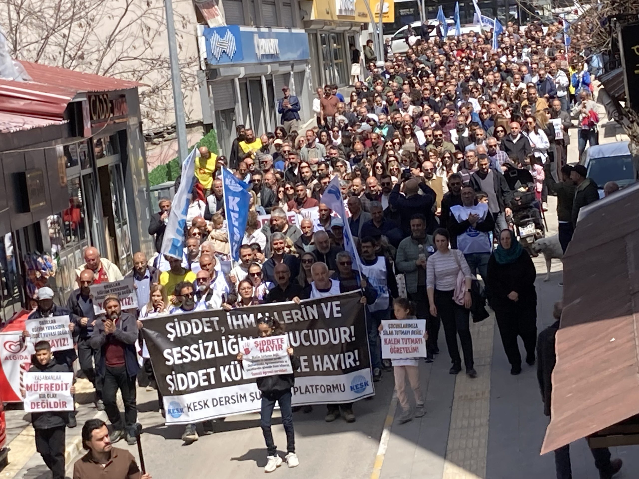 Şanlıurfa Siverek’teki okul saldırısının üzerinden henüz 24 saat geçmeden Kahramanmaraş Ayser Çalık Ortaokulu’ndan gelen katliam haberi, tüm ülkede olduğu gibi Dersim’de de kaygı yarattı. KESK Dersim Şubeler Platformu öncülüğünde bir araya gelen yüzlerce kişi, Sanat Sokağı’ndan Seyit Rıza Meydanı’na kadar sloganlarla yürüyerek eğitimde artan şiddet iklimine “Yeter artık!” dedi.