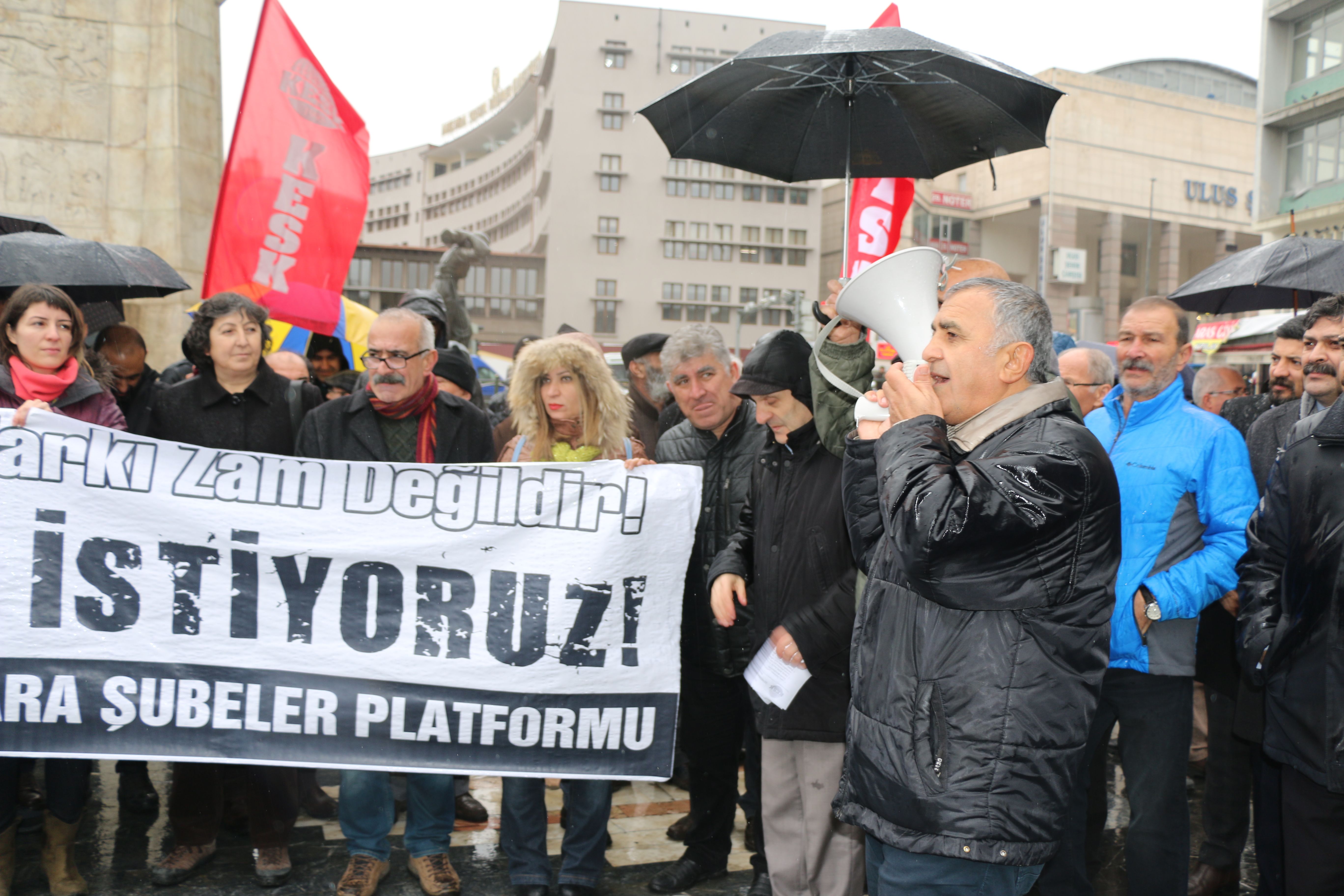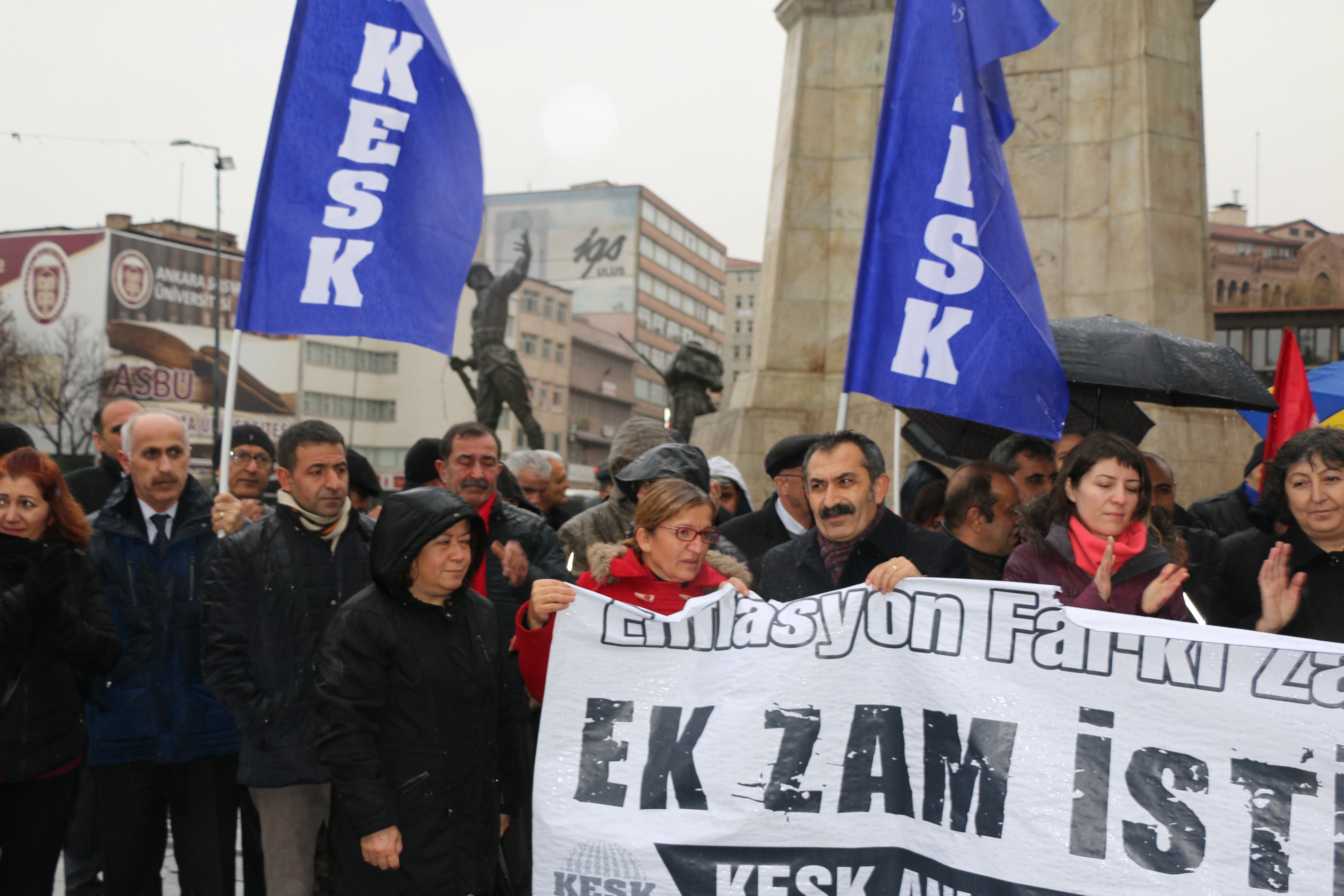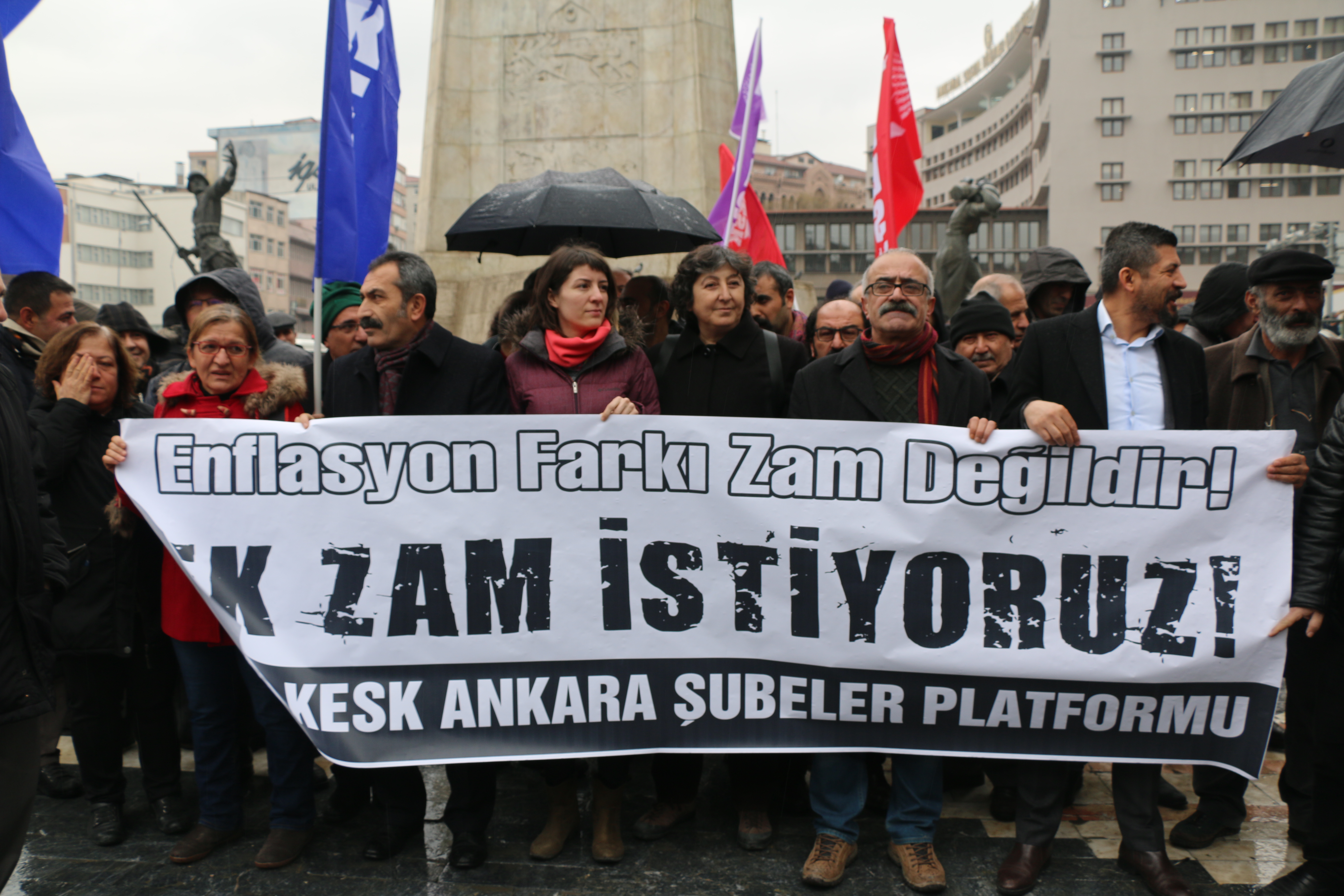 KESK Ankara Şubeler Platformu Enflasyon, ‘Enflasyon farkı zam değildir, ek zam istiyoruz’ talebiyle Ulus Heykel’de bir basın açıklaması gerçekleştirdi. Yoğun yağmur altında gerçekleştirilen basın açıklamasına KESK Eş Genel Başkanı Aysun Gezer ve MYK üyeleri, şube yöneticileri ve sendika üyeleri katıldı. Basın açıklaması metnini KESK Ankara Şubeler Platformu adına BES Büro emekçiler sendikası Ankara 1 No’lu Şube Başkanı İsmet Meydan okudu.