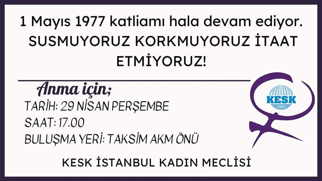 KESK İstanbul Kadın Meclisi, 29 Nisan Perşembe günü saat 17.00’de Taksim AKM önünde 1 Mayıs 1977 yılında katliamda hayatını kaybedenleri anacağını duyurdu.