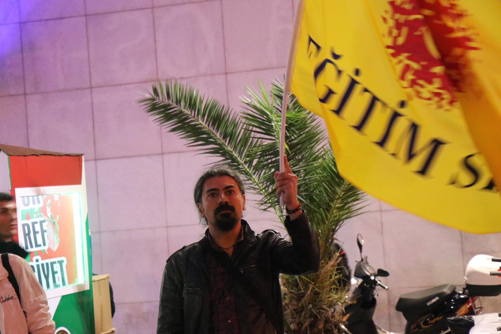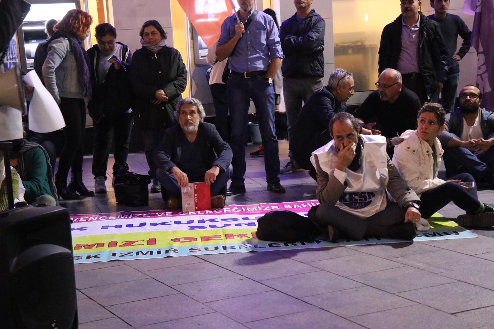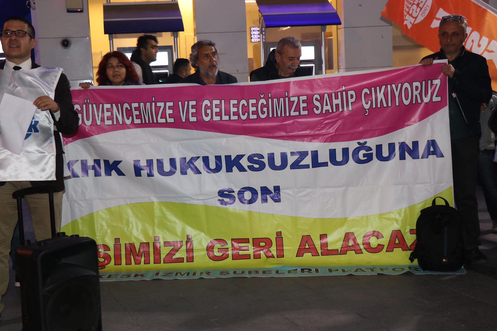 Olağanüstü Hal (OHAL) ve Kanun Hükmünde Kararnamelerle (KHK) yapılan ihraçlara karşı her hafta eylem yapan Eğitim ve Bilim Emekçileri Sendikası (Eğitim-Sen) İzmir Şubesi, 78’inci kez sokağa çıktı. Karşıyaka Çarşı girişinde bir araya gelen Eğitim Sen üyeleri “Baskı ve faşizme inat, birlik mücadele dayanışma ile mutlaka kazanacağız” pankartı açtı.