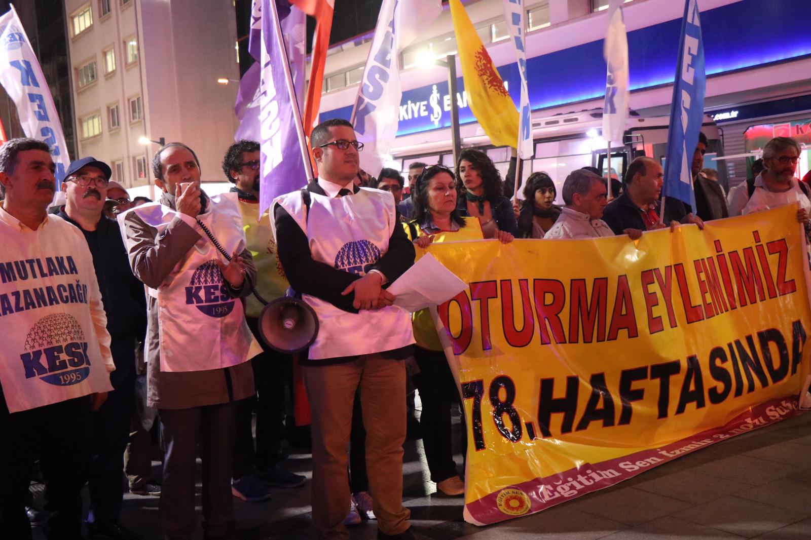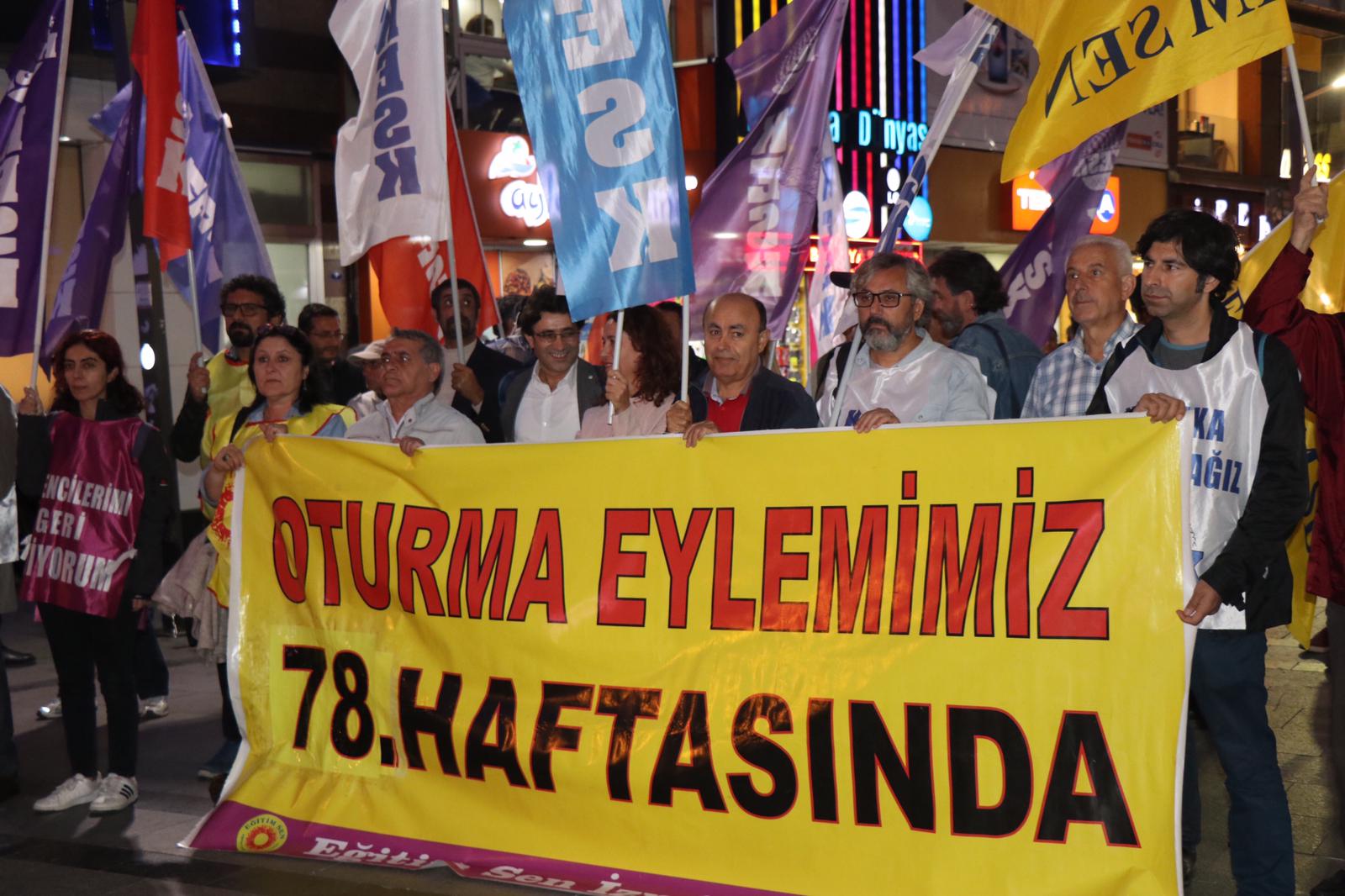 Bozgeyik, “AKP ve saray rejiminin uyguladığı ekonomik ve siyasal politikalarlarına teslim olmayan, tek adam rejimine biat etmeyen bizler, onbinlerce kamu emekçisi ile birlikte, KHK’ler eliyle haksız ve hukuksuz işten atıldık. Ülkede yaşanan soyguna, talana, haksızlıklara karşı sessiz kalmamız istendi. Yaşadıklarımız karşısında korkmadık, susmadık, biat etmedik, geri adım atmadık. Demokrasiye barışa ve özgürlüklere olan sevdamız büyüdü. Hakikatlere bağlılığımızı, aydınlık bir ülke yaratma inancımızı 78 haftadır burada birlikte yaptığımız bu oturma eylemleriyle sürdürüyoruz” dedi.