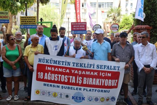 Kamu Emekçileri Sendikaları Konfederasyonu (KESK) Mersin Şubeler Platformu, Toplu İş Sözleşmesi (TİS) görüşmelerinde iktidarın kamu emekçilerine dönük zam teklifine ilişkin Özgür Çocuk Parkı’nda basın açıklaması gerçekleştirdi.“Hükümetin teklifi sefalet. İnsanca yaşamak için 18 Ağustos’ta iş bırakıyoruz” pankartı açılan açıklamada sık sık, “Direne direne kazanacağız” ve “Sefalete teslim olmayacağız” sloganları atıldı. Açıklamaya Emek ve Demokrasi Platformu bileşenleri de destek verdi.