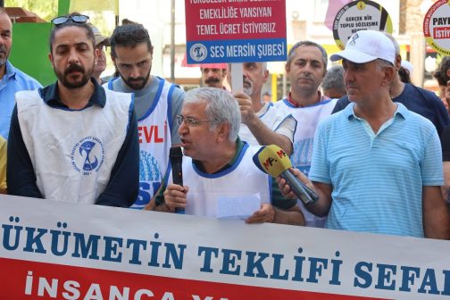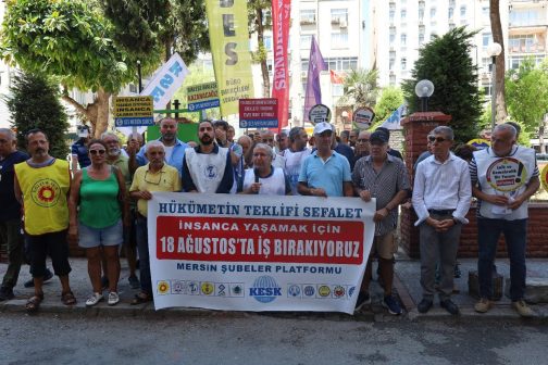 Kamu Emekçileri Sendikaları Konfederasyonu (KESK) Mersin Şubeler Platformu, Toplu İş Sözleşmesi (TİS) görüşmelerinde iktidarın kamu emekçilerine dönük zam teklifine ilişkin Özgür Çocuk Parkı’nda basın açıklaması gerçekleştirdi.“Hükümetin teklifi sefalet. İnsanca yaşamak için 18 Ağustos’ta iş bırakıyoruz” pankartı açılan açıklamada sık sık, “Direne direne kazanacağız” ve “Sefalete teslim olmayacağız” sloganları atıldı. Açıklamaya Emek ve Demokrasi Platformu bileşenleri de destek verdi.
