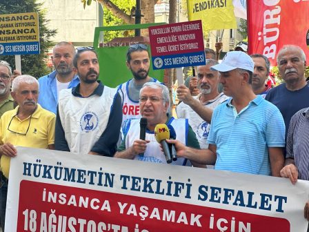 Basın metnini okuyan Eğitim-Sen Mersin Şube Başkanı Mahmut Sümbül, TİS görüşmelerinde iktidarın kamu emekçilerine yoksulluğu reva gördüğünü belirterek, “Bugün ikinci teklifi bekliyoruz. Bu teklif gerçekleşmediğinde de sizlerle paylaşacağım ortak eylemlilik kararını hep birlikte hayata geçireceğiz. İkinci teklif, taleplerimizi karşılayacak bir rakama karşılık gelmezse 18 Ağustos Pazartesi günü tüm yurtta bir günlük hizmet üretmeme ve iş bırakma eylemini hep birlikte hayata geçireceğiz. Buradan sendikalı-sendikasız tüm kamu emekçilerine sesleniyoruz; 18’inde hizmet üretmeyerek, üretimden gelen gücünüzü kullanarak bize reva görülen sefalet ücretine karşı alanlarda olun. Kamu emekçilerinin sesini yükseltin” diye konuştu.