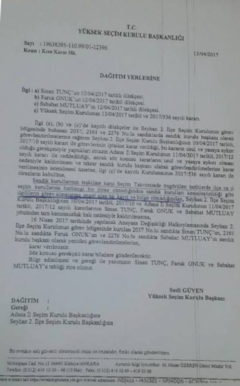 Eğitim Sen Adana şube başkanı Ahmet Karagöz, “16 Nisan 2017 tarihinde yapılacak olan Anayasa Değişikliği Halk oylamasında Seyhan 2. İlçe Seçim Kurulunun görev bölgesinde bulunan KESK’e bağlı sendikalarımızın 40’a yakın üye ve yöneticinin sandık kurulu görevi AKP Adana İl Örgütünün başvurusu üzerine; Sandık Kurulu görevleri iptal edilmişti” ifadelerini kullandı.