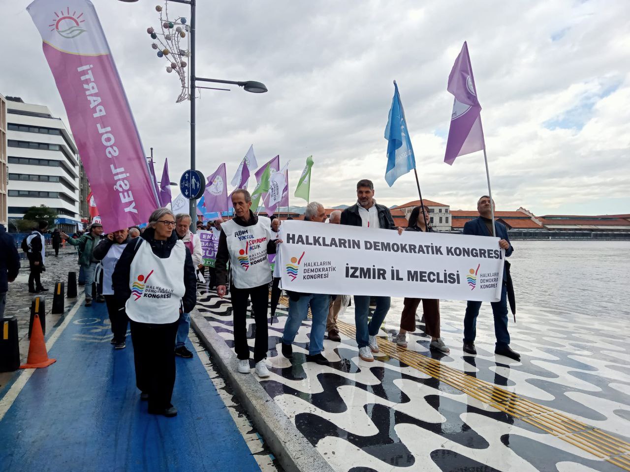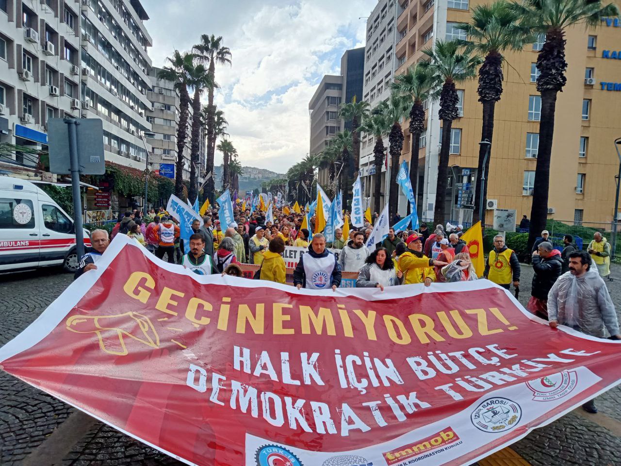 Miting için Konak Eski Sümerbank önünde toplanan kitle mitingin yapılacağı Cumhuriyet Meydanına kadar yürüdü.  “Geçinemiyoruz. Halk için bütçe, demokratik Türkiye”, Savaşa, talana yoksulluğa karşı halk için bütçe”, “Sermayeye değil emekçiye bütçe” pankartları açılan yürüyüşte “AKP mezara halk iktidara”, “Sefalete teslim olmayacağız”, “Kurtuluş yok tek başına ya hep beraber ya hiçbirimiz”, “Yaşasın sınıf dayanışması”, “AKP’ye kul sermayeye köle olmayacağız” ve “Faşizme karşı omuz omuza” sloganları atıldı.