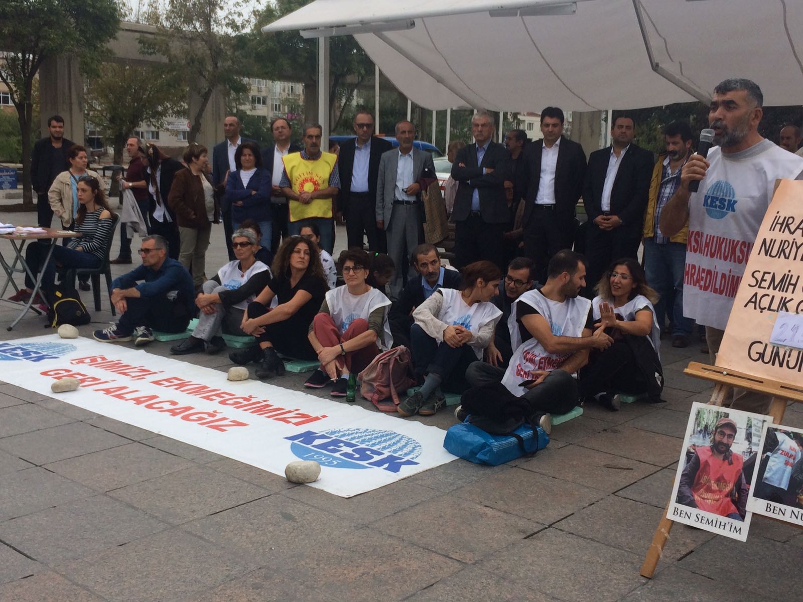 Daha sonra sözü KHK ile ihraç olan ve 33 haftadır işini isteyen BES 1 No’lu Şube Başkanı Dursun Doğan söz aldı. Doğan, Nuriye Gülmen ve Semih Özakça’nın direnişlerinin tüm dünyaya AKP faşizmini teşhir ettiğini, arkadaşlarının biran önce serbest bırakılmaları ve işe geri dönmelerini talep ettiklerini vurguladı. Doğan, Gülmen ve Özakça’nın avukatlarının tutuklandığı, bunun da iki eğitimciden ne kadar korkuluğunu ortaya koyduğunu aktardı. Doğan, duyarlı kesimleri 20 Ekimde Ankara’daki Gülmen ve Özakça’nın mahkemesine davet etti.