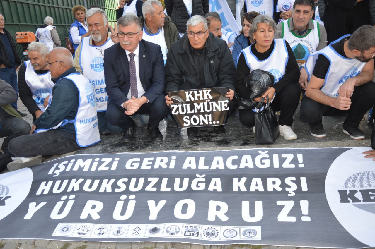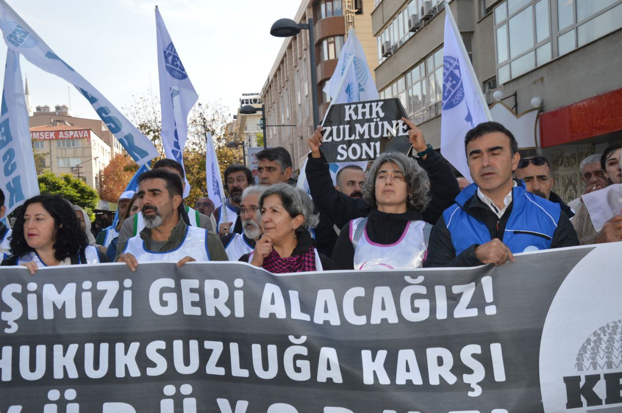 Kanun Hükmünde Kararnameler (KHK) ile kamu görevinden ihraç edilenlerin işlerine iadesi için Kamu Emekçileri Sendikaları Konfederasyonu (KESK) tarafından 14 Ekim’de Diyarbakır’dan Ankara’ya başlatılan yürüyüş dün tamamlandı. Ankara’ya ulaşan KESK’liler, Eğitim ve Bilim Emekçileri Sendikası (Eğitim Sen) Genel Merkezi’nin önünde toplanarak Meclis’e yürümek istedi. KESK’liler, polis tarafından abluka altına alındı.