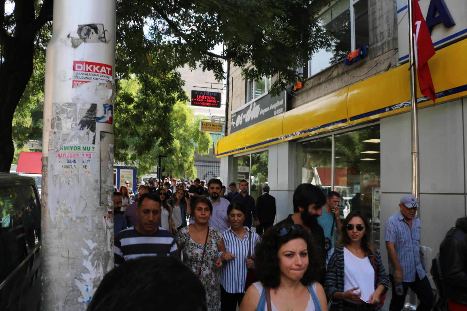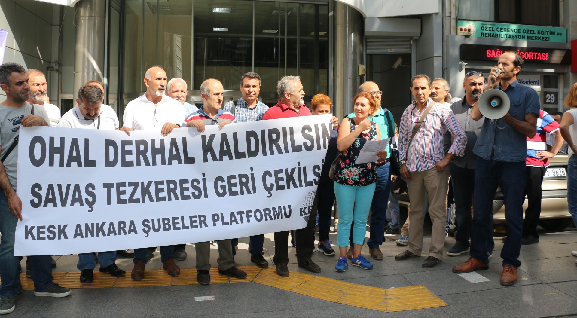 KESK ve bağlı sendika üyesi kamu emekçileri, OHAL ve KHK’lere karşı bu hafta da eylem yaptı. Valilik yasağı nedeniyle bu hafta Kızılay Sakarya caddesinde yapılmak istenen basın açıklaması Mithat paşa Caddesi’nde bulunan Eğitim- Sen 5 No’lu Şube binası önünde yapıldı.