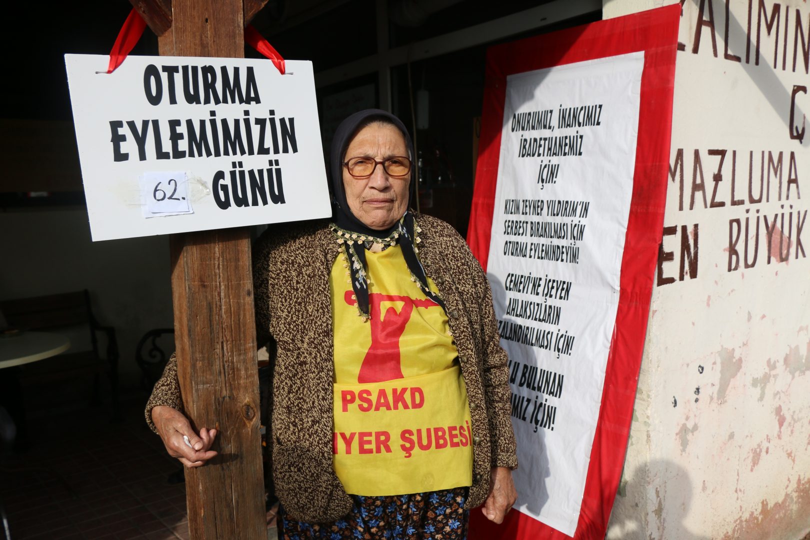 “Kızım değil cemevine idrarını yapanlar tutuklansın” dövizini asan anne Bektaş, ilerleyen yaşına rağmen aylardır soğuk sıcak, yağmur çamur demeden oturma eylemini sürdürüyor. Kezban Ana kızı Zeynep Yıldırım serbest bırakılıncaya kadar eylemini sürdüreceğini söylüyor.