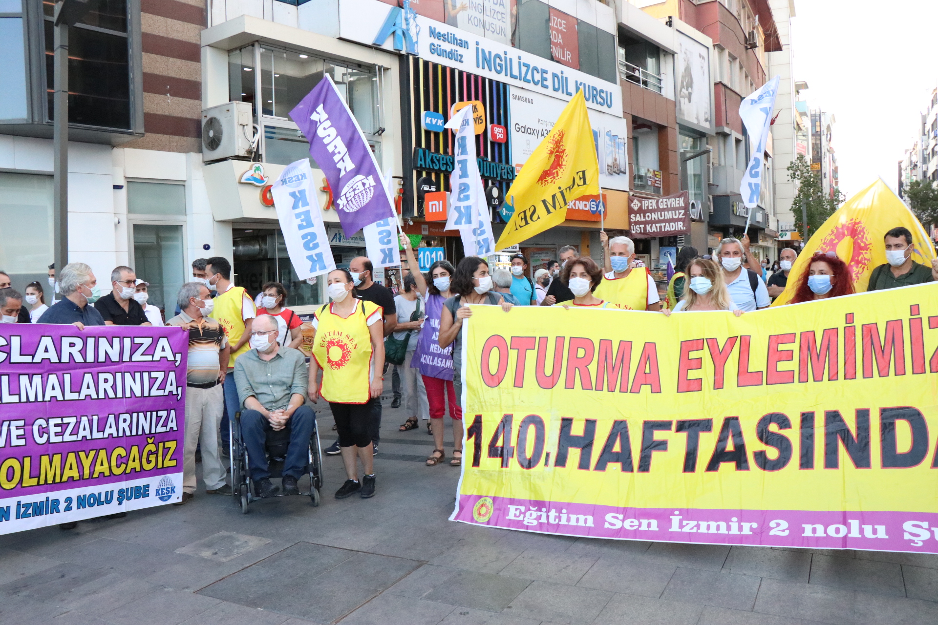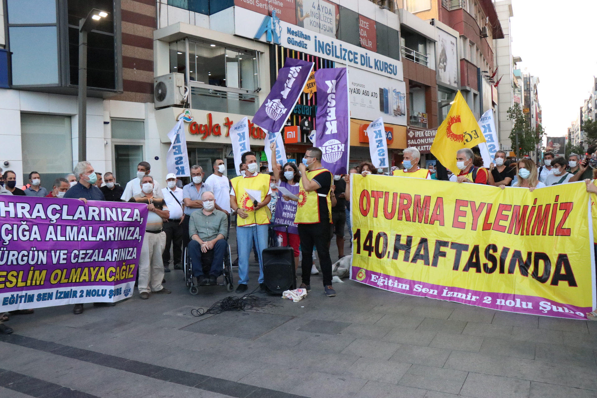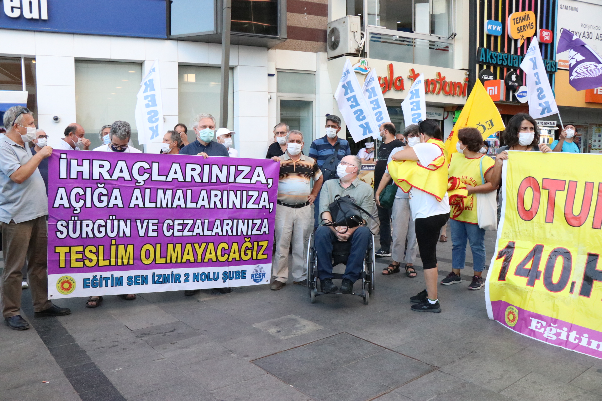 KESK İzmir Şubeler Platformunun ihraçlara karşı düzenledikleri oturma eylemleri Karşıyaka İskele karşısında yeniden başladı. 140.haftada devam eden oturma eyleminde haksız, hukuksuz ihraçlar protesto edildi.