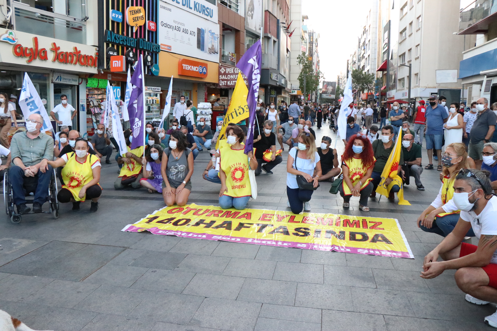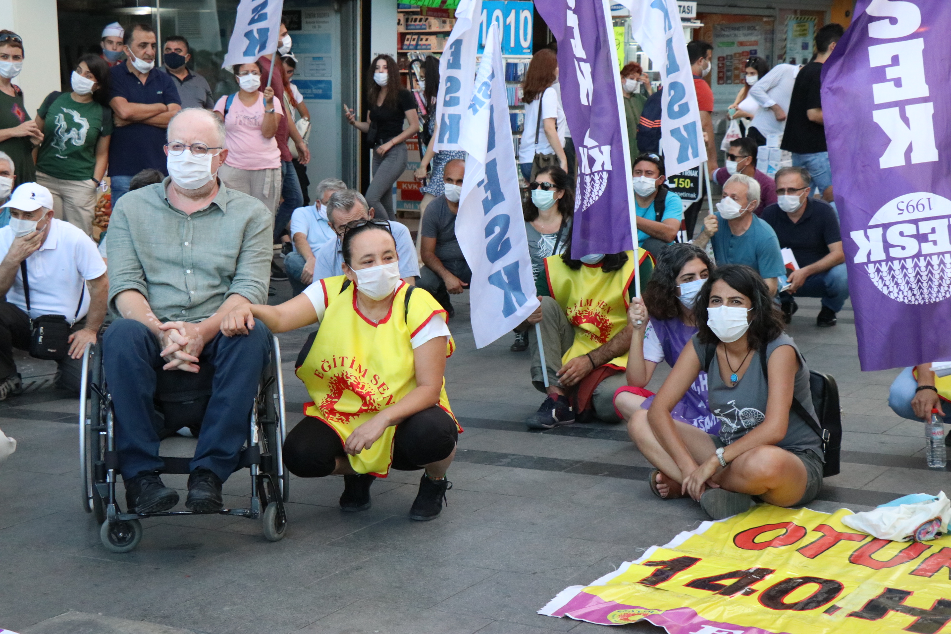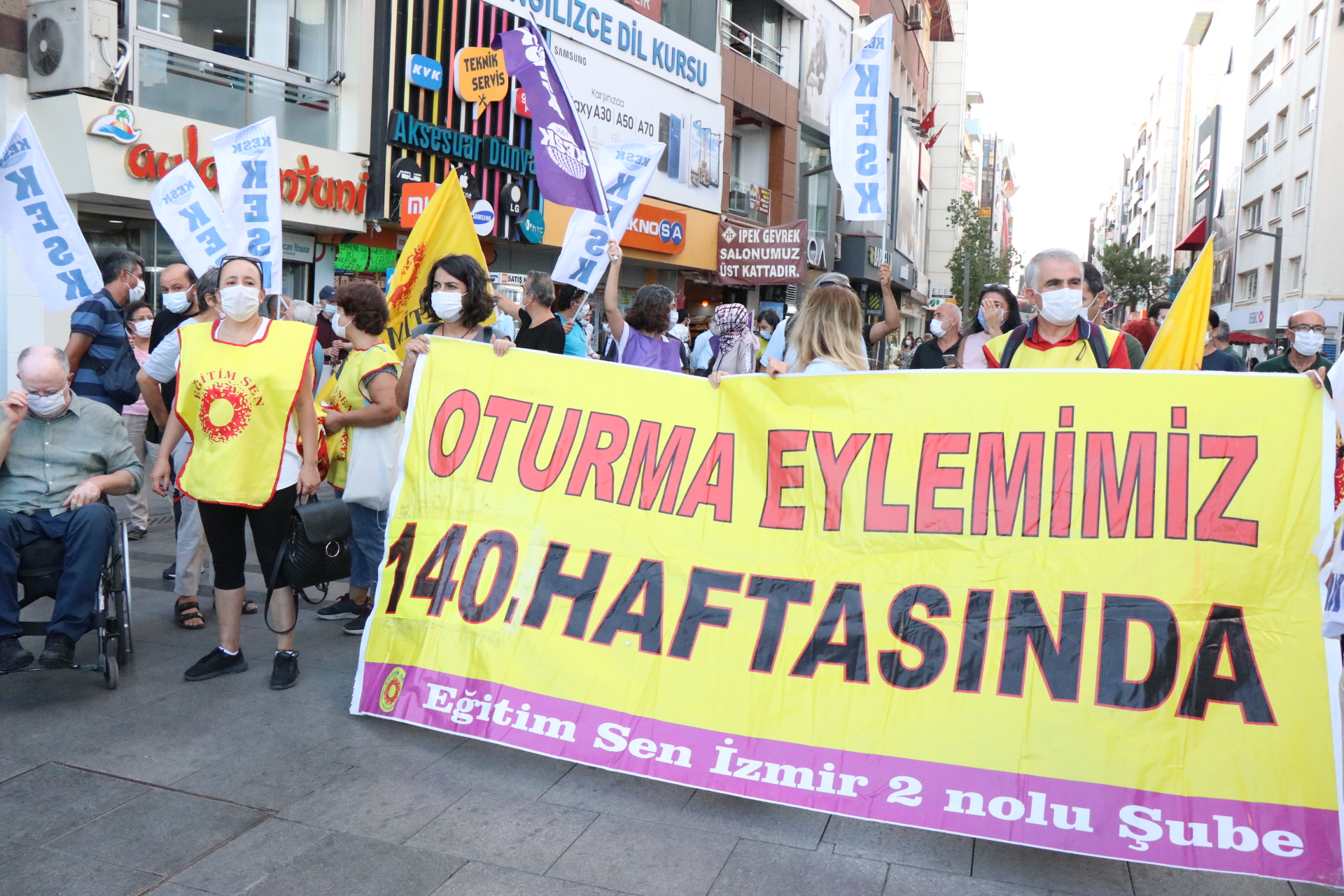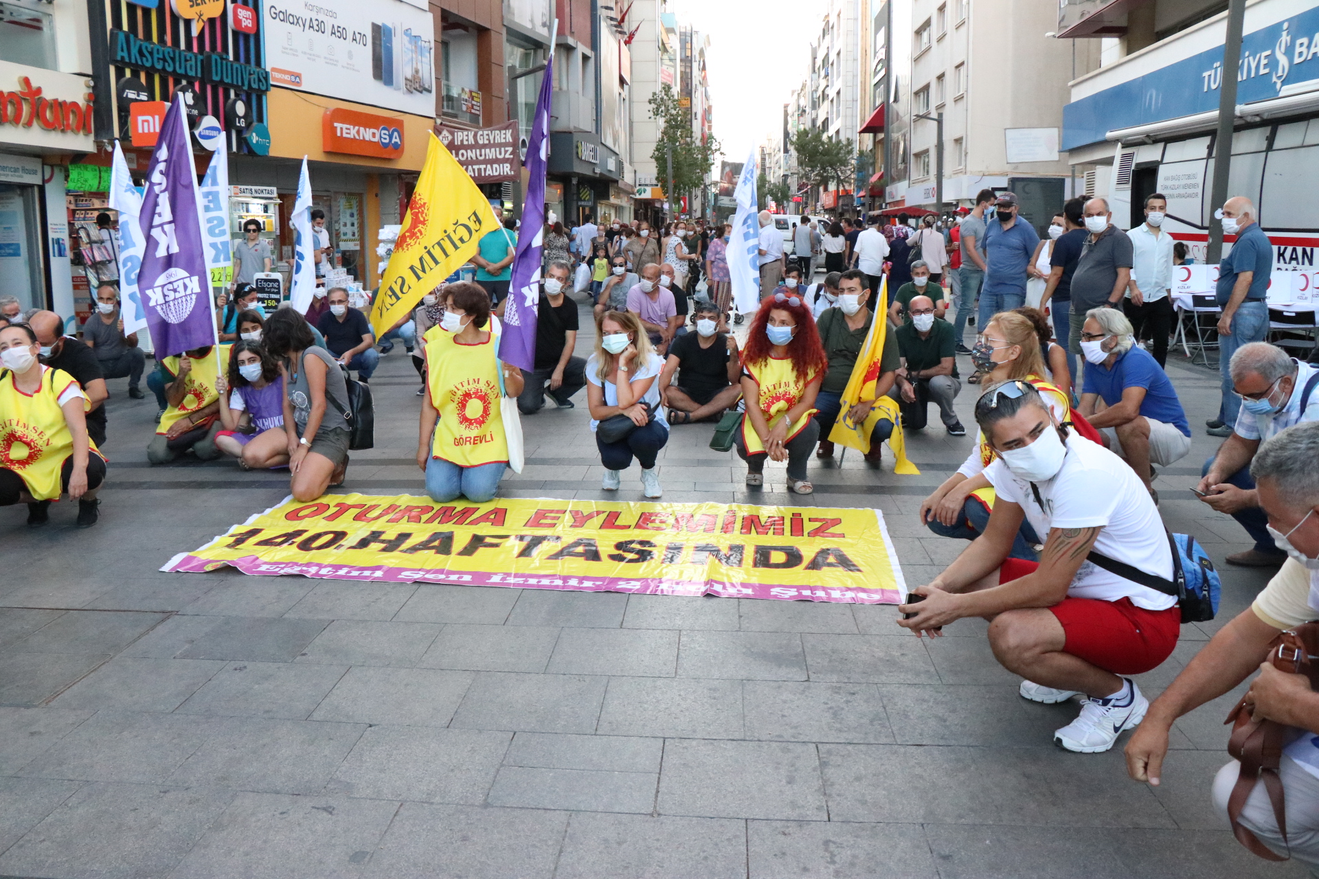 KESK İzmir Şubeler Platformunun ihraçlara karşı düzenledikleri oturma eylemleri Karşıyaka İskele karşısında yeniden başladı. 140.haftada devam eden oturma eyleminde haksız, hukuksuz ihraçlar protesto edildi.