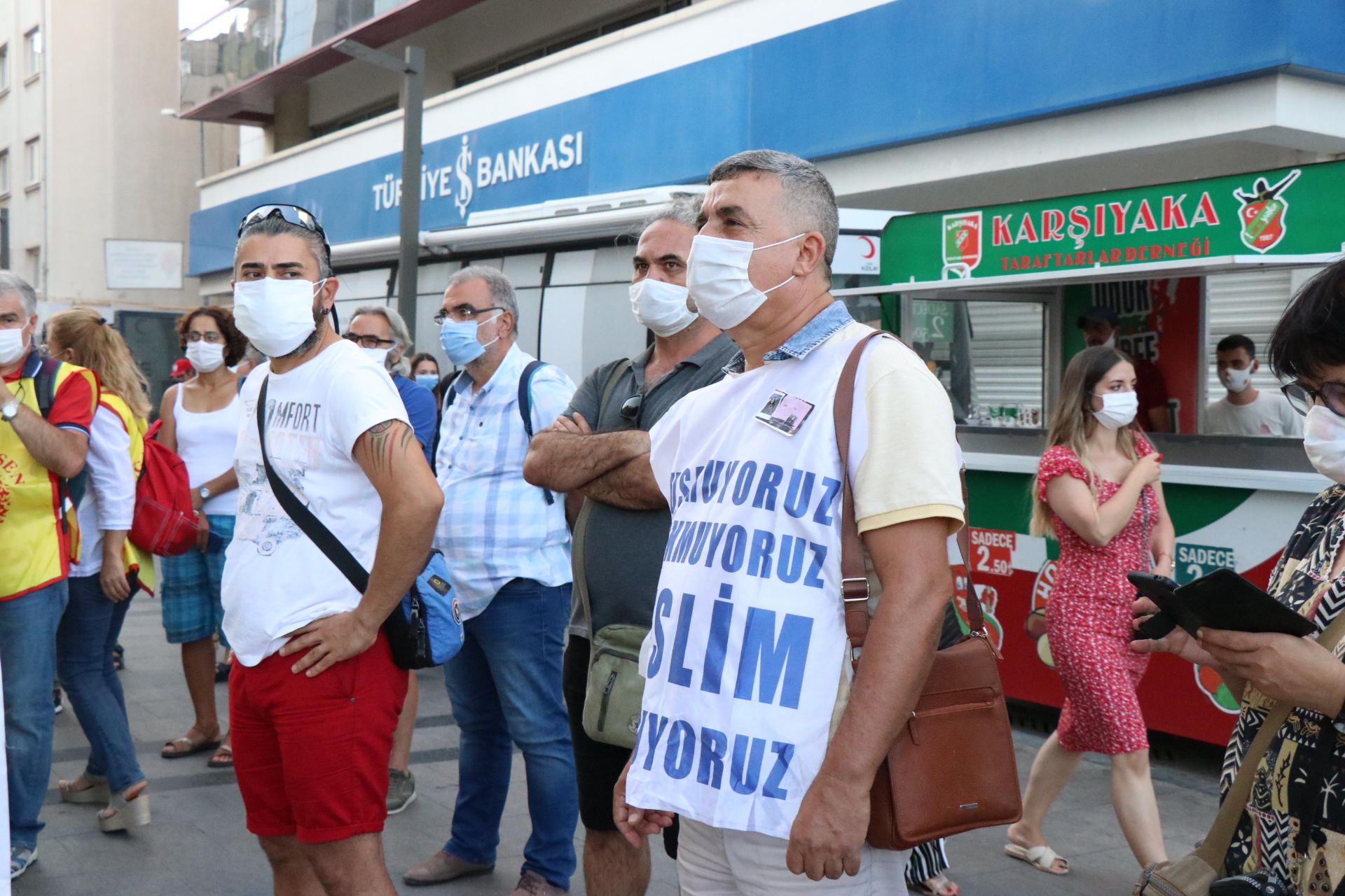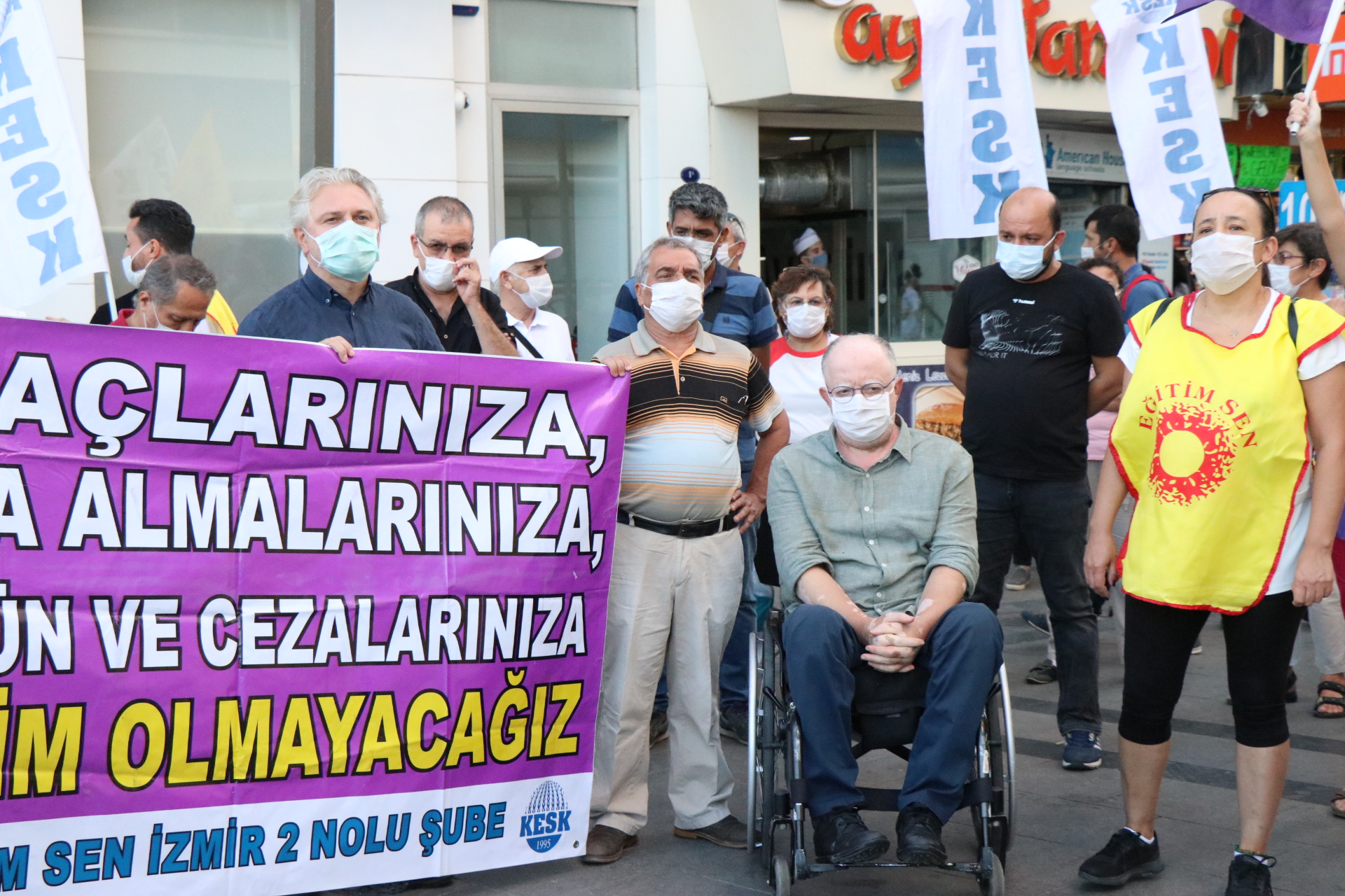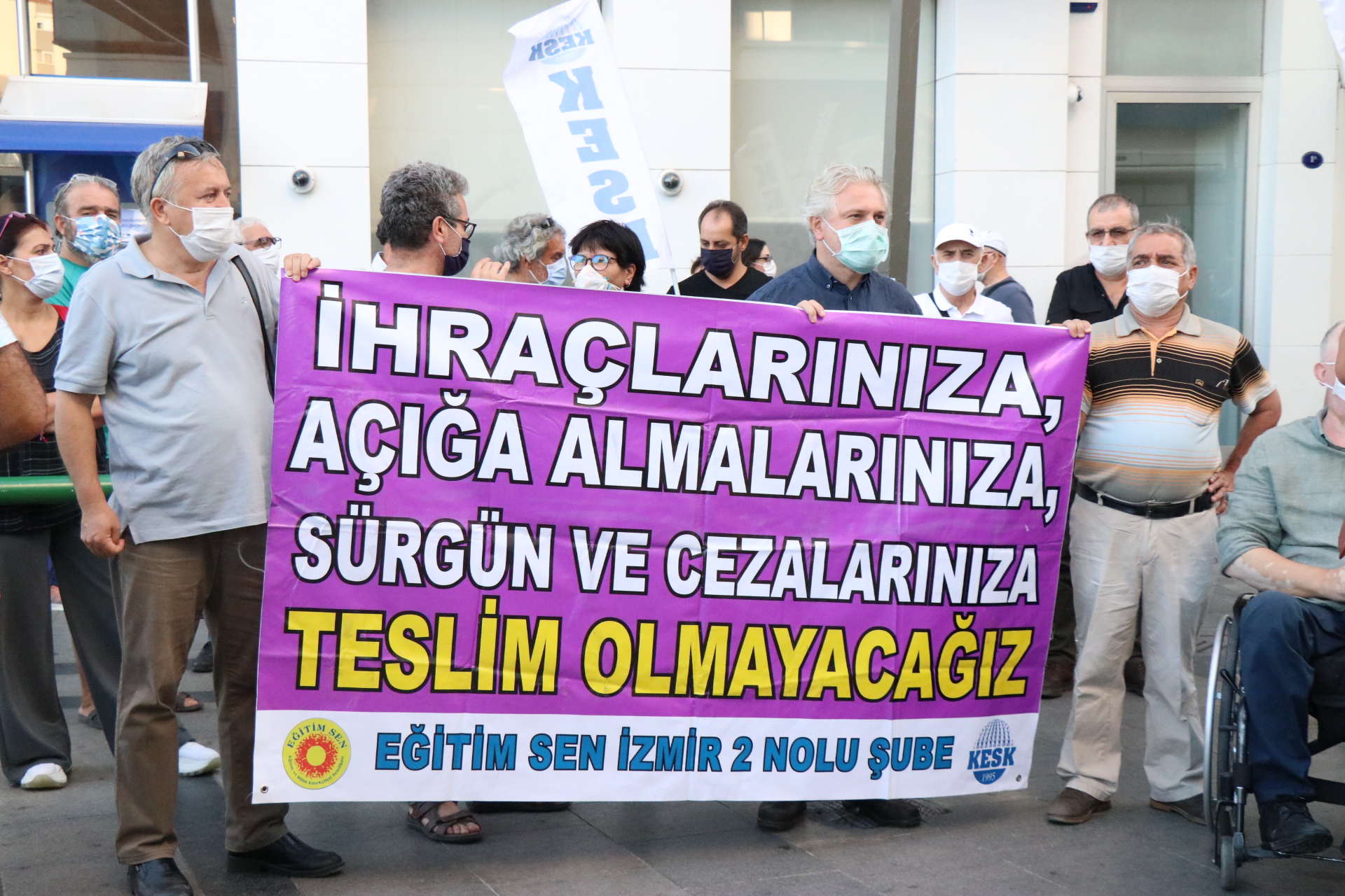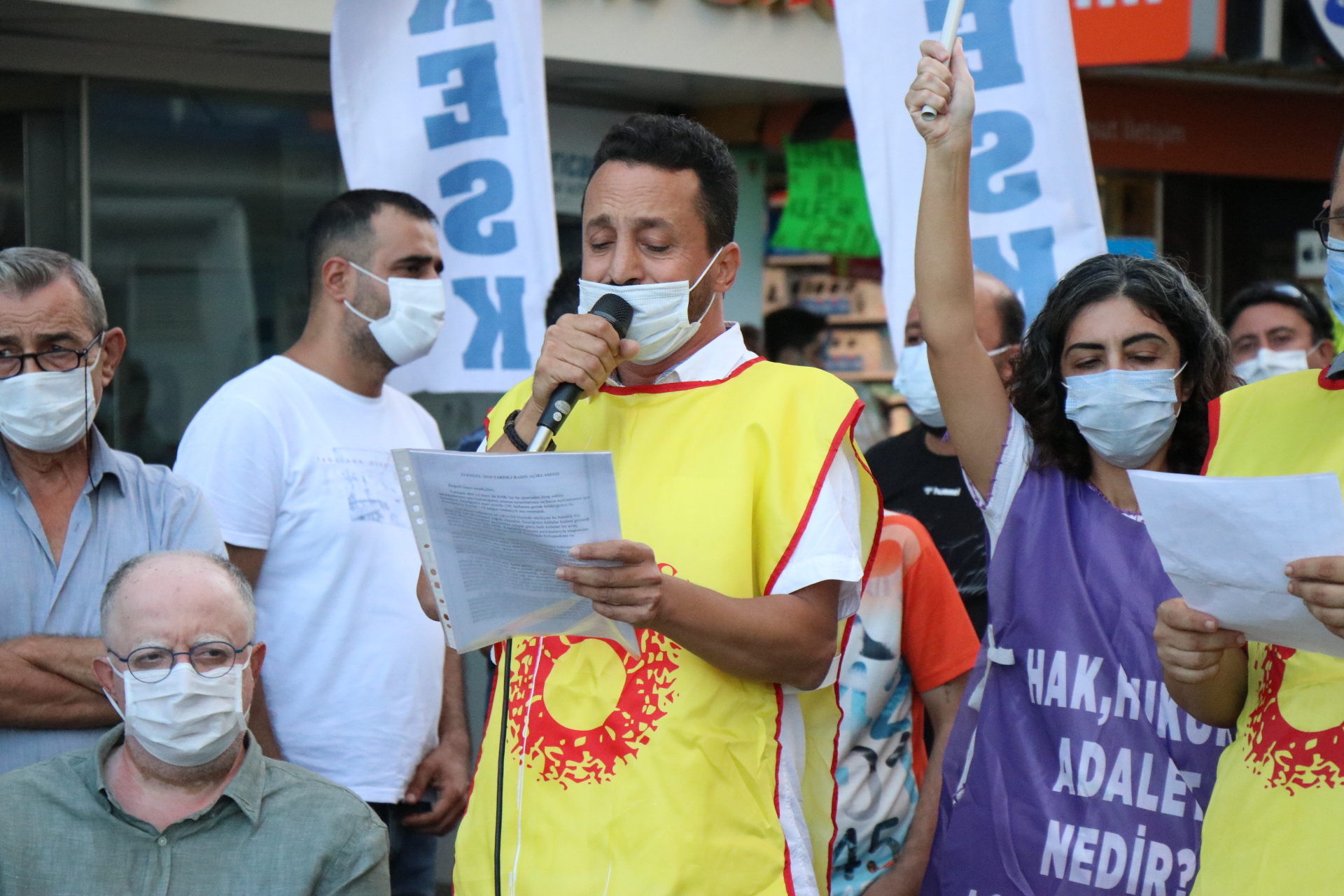 Karşıyaka çarşıda yapılan açıklamaya Halkların Demokratik Partisi (HDP) Milletvekilleri Musa Piroğlu ve Murat Çepni ve çok sayıda kamu emekçisi katıldı. “Açığa almalarınıza, sürgün ve cezalarınıza teslim olmayacağız” pankartının açıldığı açıklamada, “Asla yalnız yürümeyeceksin” ve “Faşizme karşı omuz omuza” sloganları attı.