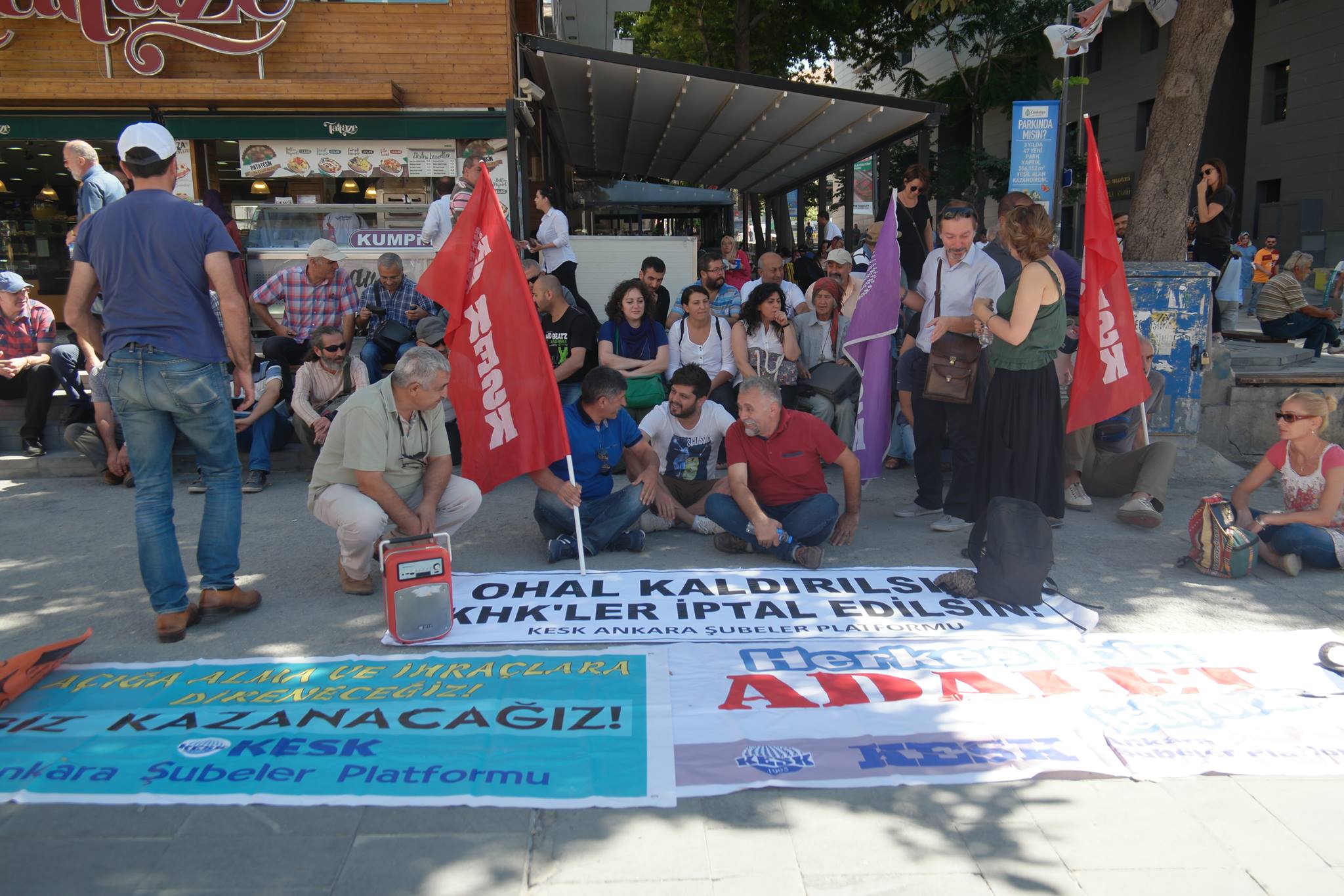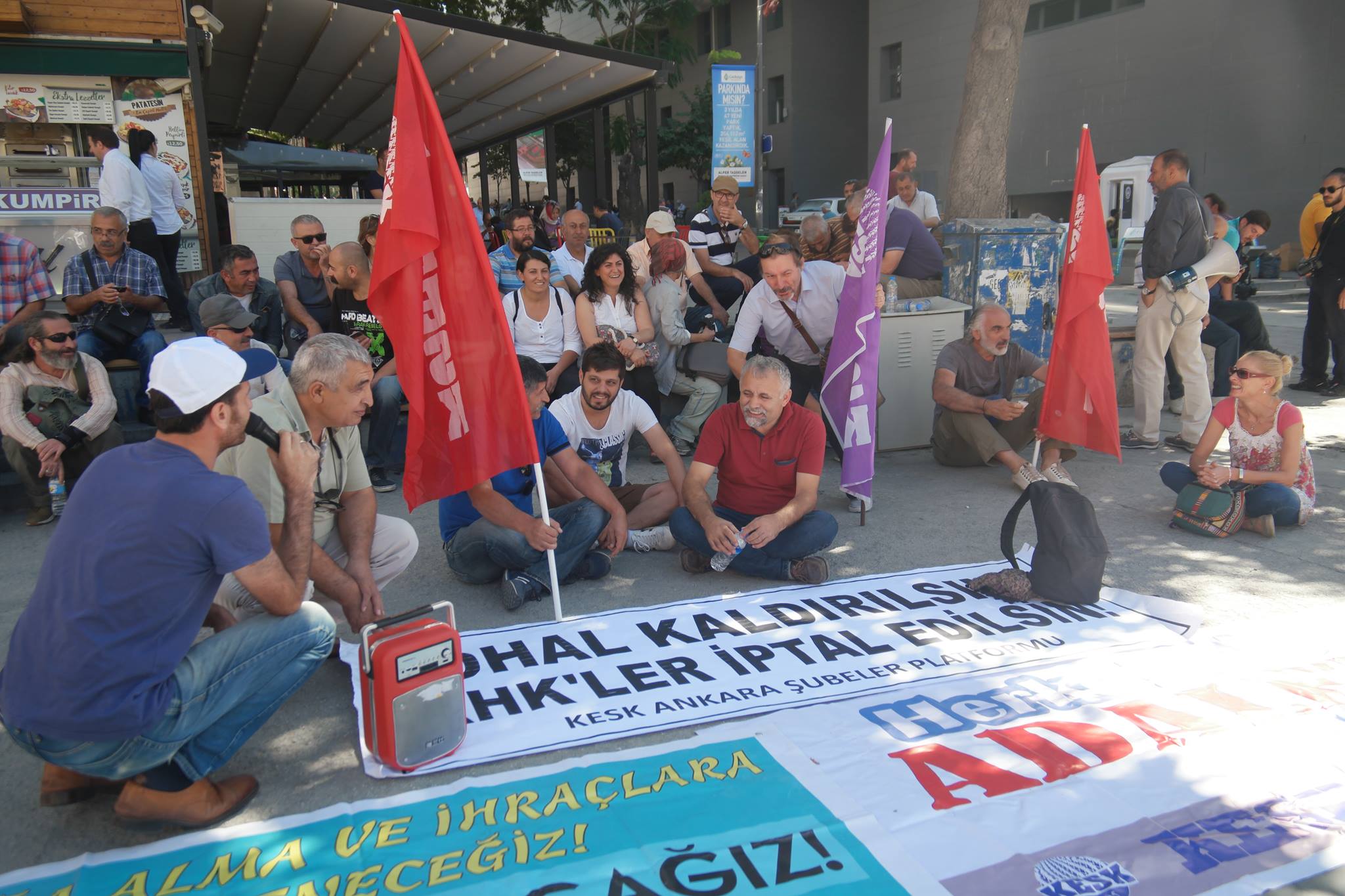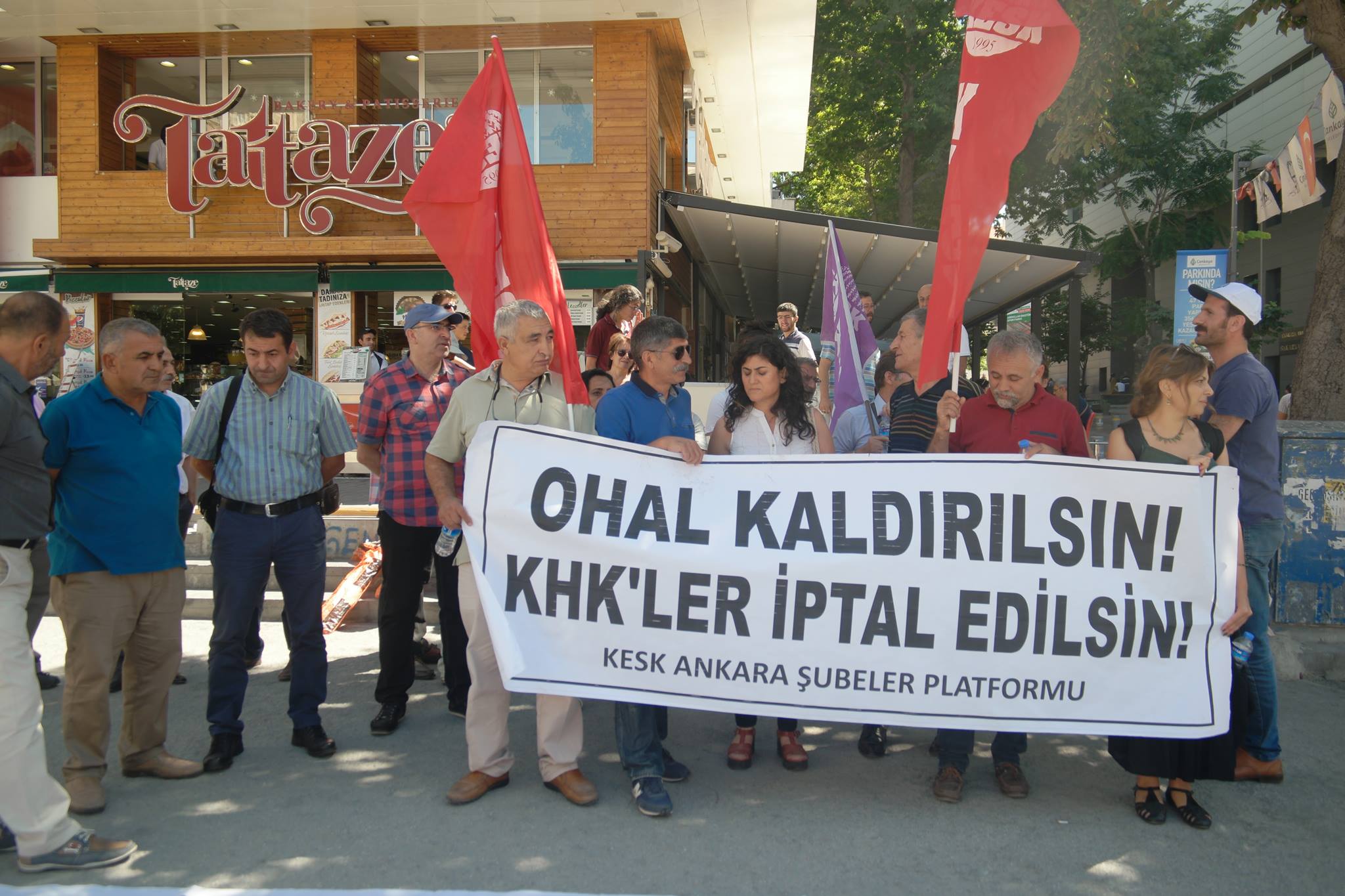 KESK KHK’leri protesto etmek için Ankara’da bulunan Sakarya Caddesi’nde basın açıklaması yaptı. Basın açıklamasını Büro Emekçileri Sendikası (BES) Genel Başkanı Serpil Akpınar’ın okudu. Akpınar, OHAL çerçevesinde tüm muhaliflerin hedef alındığı, eşitlik, adalet, barış ve insanca bir yaşam talep etmenin suç hale geldiğini vurguladı.