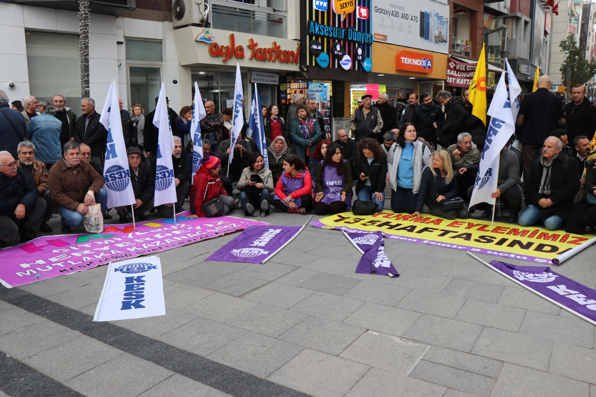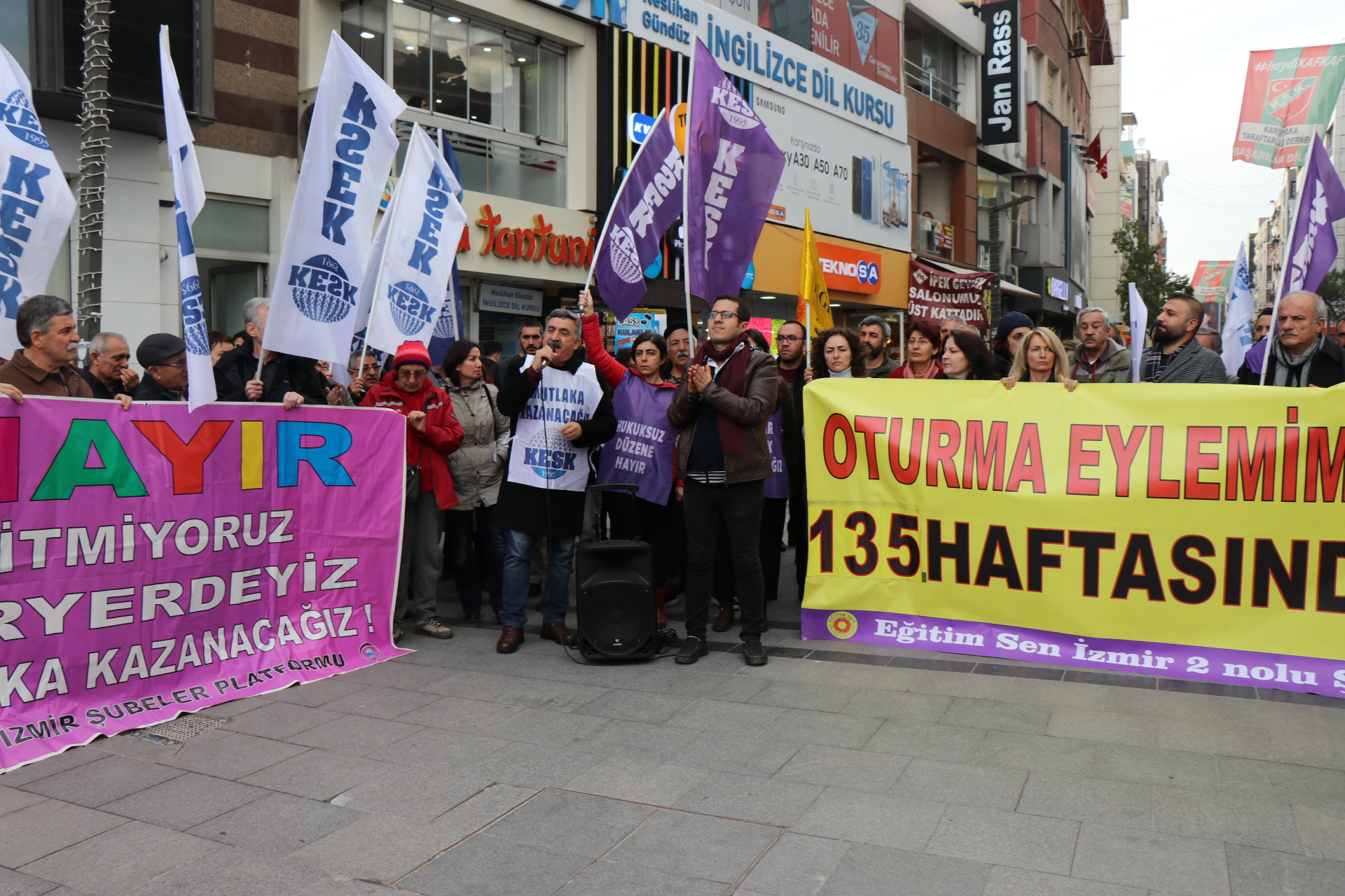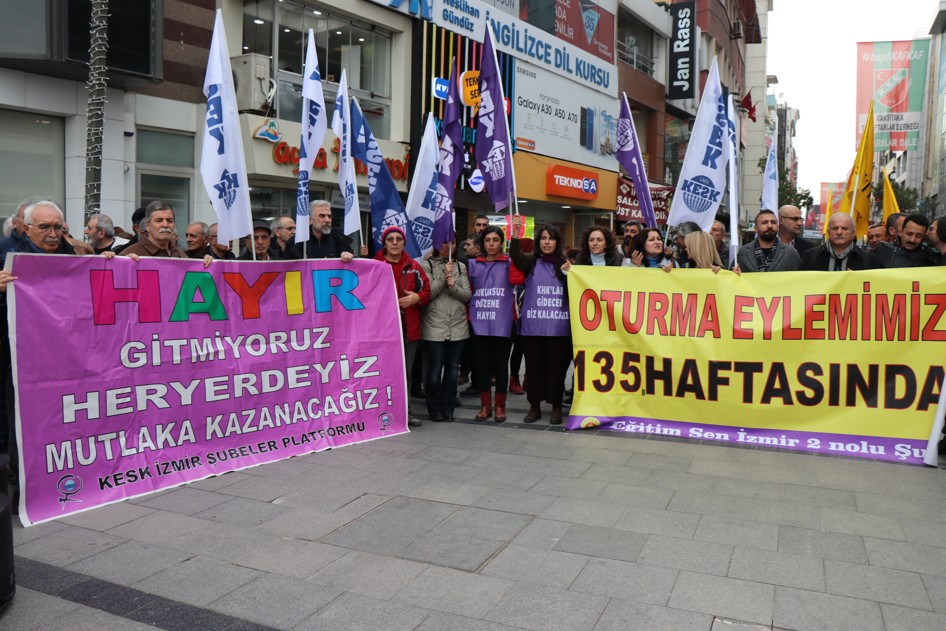 İzmir’de Kanun Hükmünde Kararname (KHK) ile işlerine son verilen Kamu Emekçileri Sendikası Konfederasyonu (KESK) üyesi emekçilerin her hafta düzenledikleri eylemin 135’inci haftasında da bir araya geldi. Eylemde sık sık “Birleşe birleşe kazanacağız”, “KHK’ler gidecek biz kalacağız” sloganları atıldı. Karşıyaka İskele Karşısında bir araya gelen KESK’li emekçiler adına açıklamayı Kamu emekçileri Sendikası İzmir Şubeler Platformu Dönem Sözcüsü Hasan Ali Kılıç okudu.