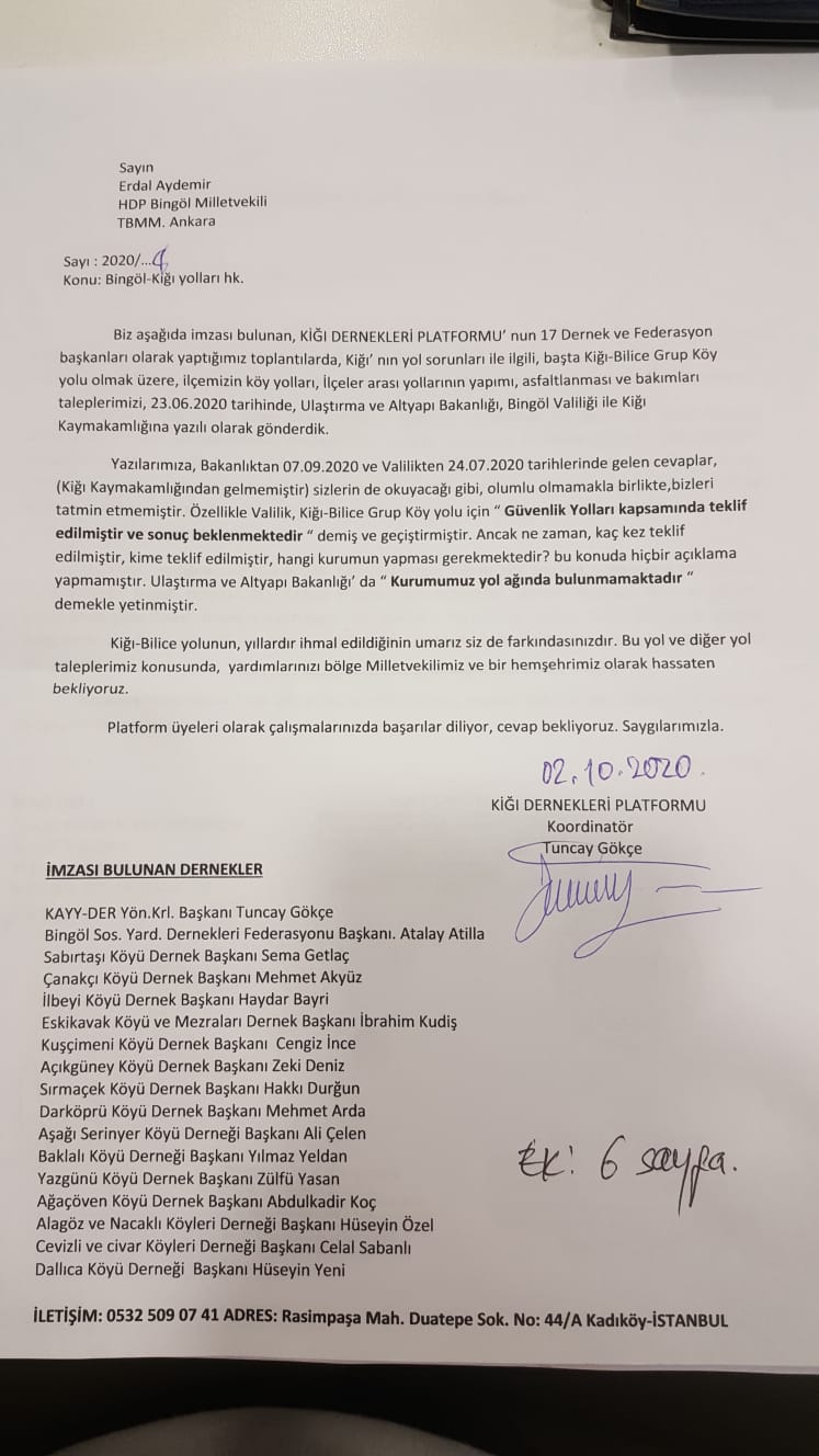 17 dernek ve federasyonun içinde yer aldığı Kiğı Dernekleri Platformu, Kiğı’nın yol sorunları ile ilgili, başta Kiğı-BiIice Grup Köy yolu olmak üzere, köy yolları, ilçeler arası yollarının yapımı, asfaltlanması ve bakımları taleplerini içeren dilekçelerini 23 Haziran tarihinde, Ulaştırma ve Altyapı Bakanlığı, Bingöl Valiliği ile Kiğı Kaymakamlığı’na yazılı olarak gönderdiklerini belirterek, yetkililerden olumsuz cevap aldıklarını ifade etti.