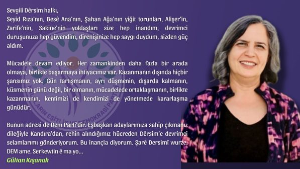 Kandıra cezaevinde tutuklu bulunan Halkların Eşitlik ve Demokrasi Partisi ( DEM Parti) Ankara Büyükşehir Belediyesi Eş Baskan adayı Gültan Kışanak, Dersim halkına bir mesaj gönderdi.