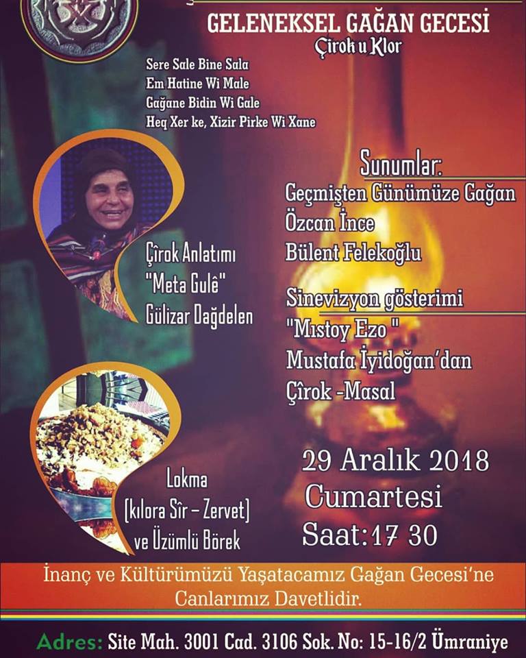 İstanbul Ümraniye’de bulunan Koçgiri Kültür Derneği, 29 Aralık Cumartesi günü ‘Geleneksel Gağan gecesi’ düzenliyor.