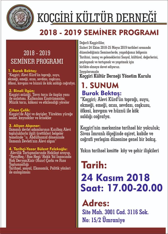 Yapılan seminerin duyurusunu yapan Koçgiri Kütür Derneği, “Sizler 24 Ekim 2018-25 Mayıs 2019 tarihleri arasında düzenlediğimiz seminerlerde, yaşadığımız bölgenin tarihini, inanç ve geleneklerini sosyal, kültürel, değerlerini paylaşmak, tartışmak ve yaşatmak için birlikte olmaya davet ediyoruz” çağrısında bulundu.