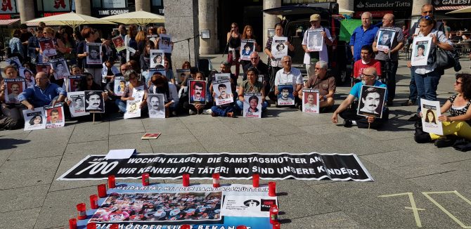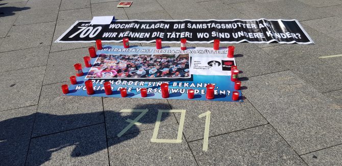 Cumartesi Anneleri’nin 701. hafta oturumu nedeniyle Almanya’nın Köln kentinde Merkezi Tren Garı’nda bir oturma eylemi düzenlendi. Eylemde adalet talep edildi. Eyleme kayıp yakınlarının yanında, çok sayıda kişi katıldı.