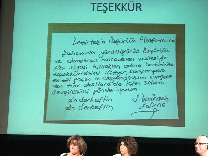 Demirtaş, avukatı aracılığıyla gönderdiği el yazılı mesajında, “Şahsımda yürüttüğünüz özgürlük ve demokrasi mücadelesi vesilesiyle tüm siyasi tutsaklar adına teşekkürlerimi iletiyor, kampanyada emeği geçen ve dayanışmasını esirgemeyen tüm dostlara da içten selam, sevgilerimi gönderiyorum” dedi.