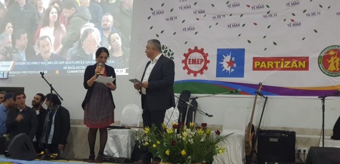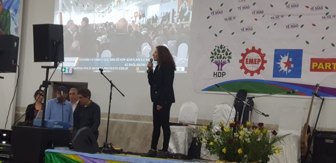 Gecede konuşan Dersim eski Belediye Başkanı Songül Erol Abdil Dersim’in 38 katliamını yaşadığını ve baskıların hala devam ettiğini belirtti. Dersim’de dile karşı da asimilasyon politikası yürütüldüğünü kaydeden Abdil, Dersim’de kendi anadilinde belediyecilik yapan, halk ile çalışıp, halka hizmet edenlerin şu an cezaevinde olduğunu ifade etti. Abdil 31 Mart’ta halkın kendi değerlerine sahip çıkarak kayyumu sandığa gömeceklerini söyledi.