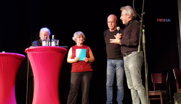 Yönetmen Barış Pirhasan da Demirtaş için bir şiir okurken, yönetmen Önder Çeker Almanya’da Kürt kurumlarına yönelik baskıları dile getirdi.