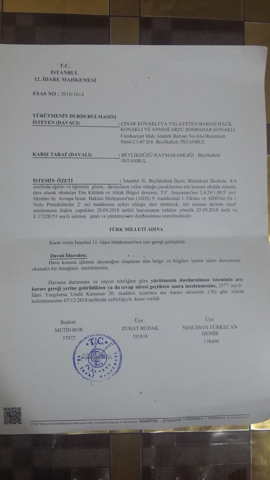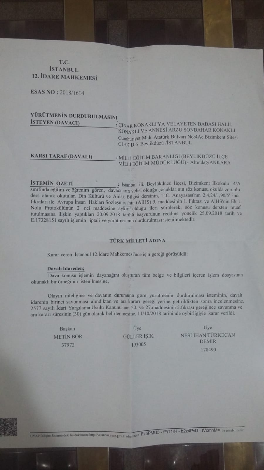 “Duruşma celse yapmadan nedense idareden bir savunma isteme gereği duydu. Ara karardan önce. Ve bunun için bir ay süre verdi. Sürüncemede bırakmak istediklerini düşünüyorum. Ama sonuçta uzayan bir süreç var. Olmaması gerektiği şekilde uzayan bir süreç var. Tabi ben bunu daha sonradan öğreniyorum. Eve mahkeme kararı bekliyorum ki ilgili mahkeme kararını okula vereyim ve çocuğun din dersine girmeyeceği resmi olarak da kesinleşsin. Ulaşmayınca telefon açtım. Telefonda yürütmeyi durdurma kararı geldiği söylendi. Ben de rahatlamıştım. Yalnız karar elime ulaşmadığı için mahkeme kalemine gitmek zorunda kaldım. Gittiğimde böyle bir kararın gelmediğini öğrendim. Sadece savunma alındıktan sonra ara karar verileceği söylendi.”