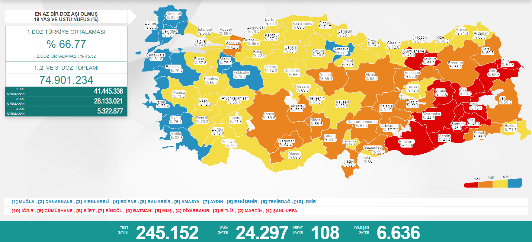 Sağlık Bakanlığı’nın günlük açıkladığı koronavirüs verilere göre son 24 saatte 245 bin 152 test yapıldı ve 24 bin 297 yeni vaka tespit edildi. 108 kişinin koronavirüs sebebiyle hayatını kaybettiği belirtildi. Tabloya göre iyileşen sayısı 6 bin 636 oldu.