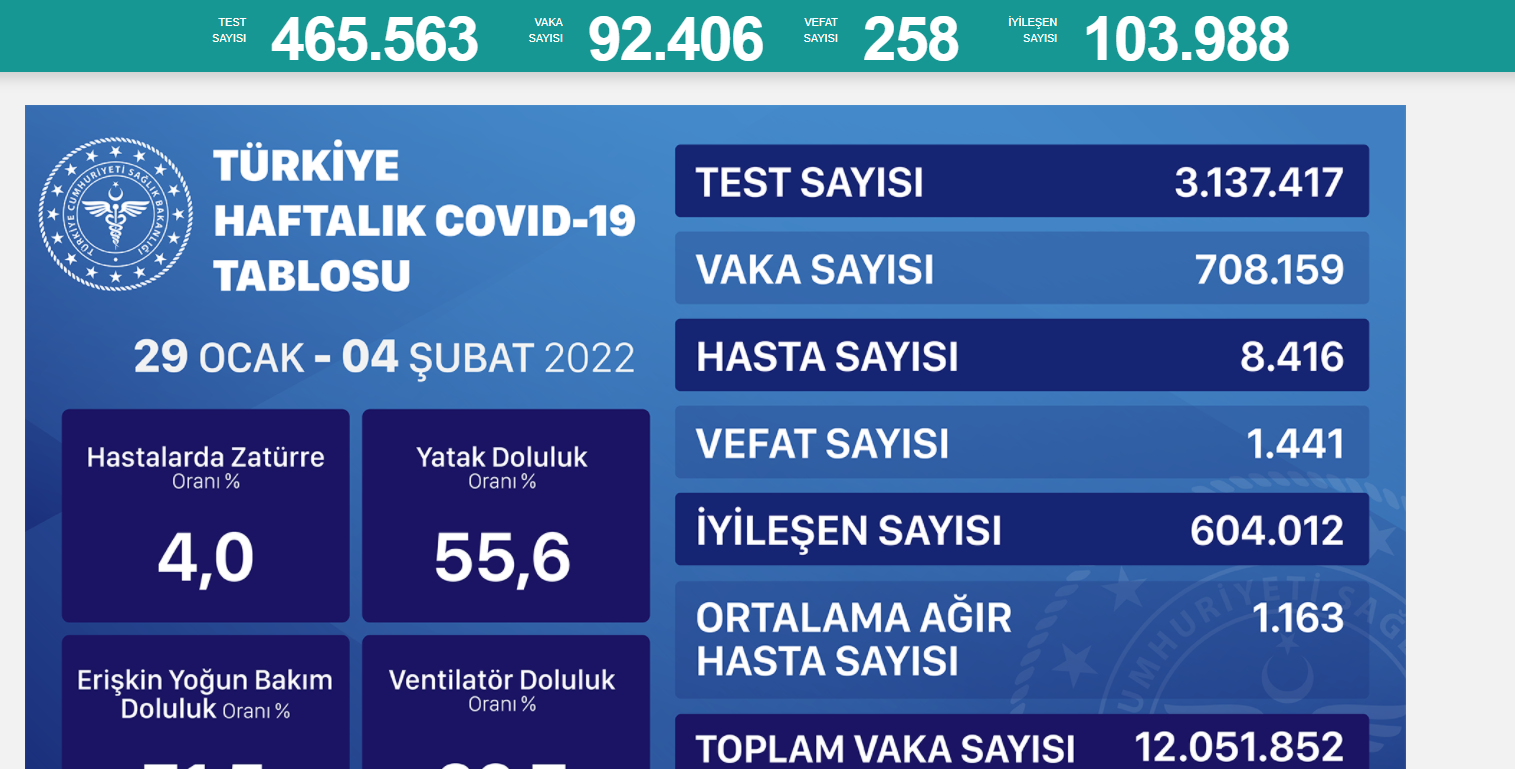 Sağlık Bakanı Fahrettin Koca paylaştığı mesajında, “Salgının Omicron döneminde, basit de olsa yeni bir hastalıkla mücadele gücü olmayan risk grubu açısından endişeliyiz. Genel olaraksa olumlu gelişmeler var: Test pozitiflik oranları düşüyor, iyileşen sayısı yeni vaka sayısının üstüne çıkıyor. Seyrin daha iyi olacağını öngörüyoruz” ifadelerine yer verdi.