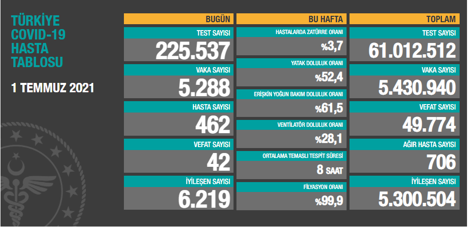 Sağlık Bakanlığı, koronavirüs (Kovid-19) günlük hasta tablosunu paylaştı. Verilere göre, Türkiye’de koronavirüs nedeniyle son 24 saatte 42 kişi daha hayatını kaybetti, 462 yeni hasta dâhil olmak üzere 5 bin 288 yeni vaka tespit edildi.