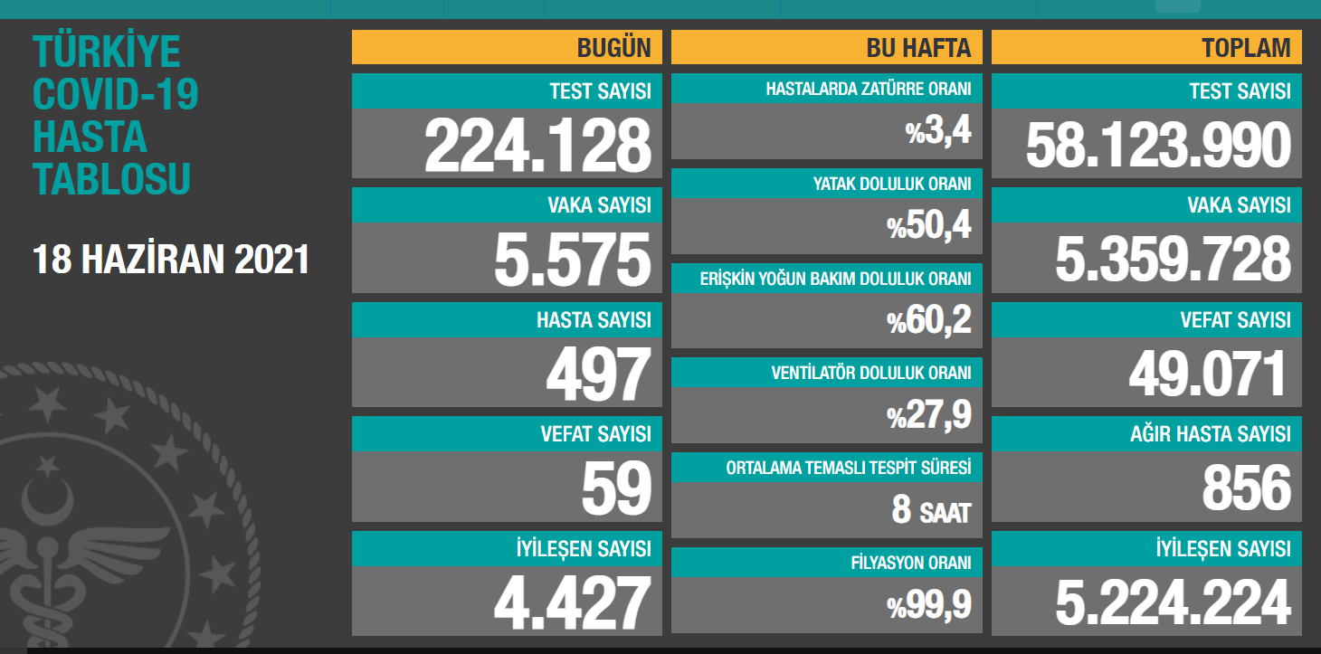 Sağlık Bakanlığı koronavirüsü günlük tablosunu paylaştı. Tabloya göre, salgın nedeniyle son 24 saatte 59 kişi yaşamını yitirirken, 5 bin 575 yeni vaka tespit edildi.