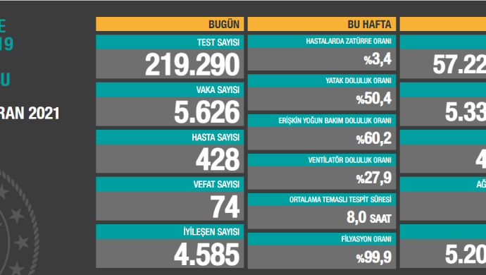 Koronavirüs nedeniyle son 24 saatte 74 kişi daha hayatını kaybetti, 5 bin 626 yeni vaka tespit edildi.