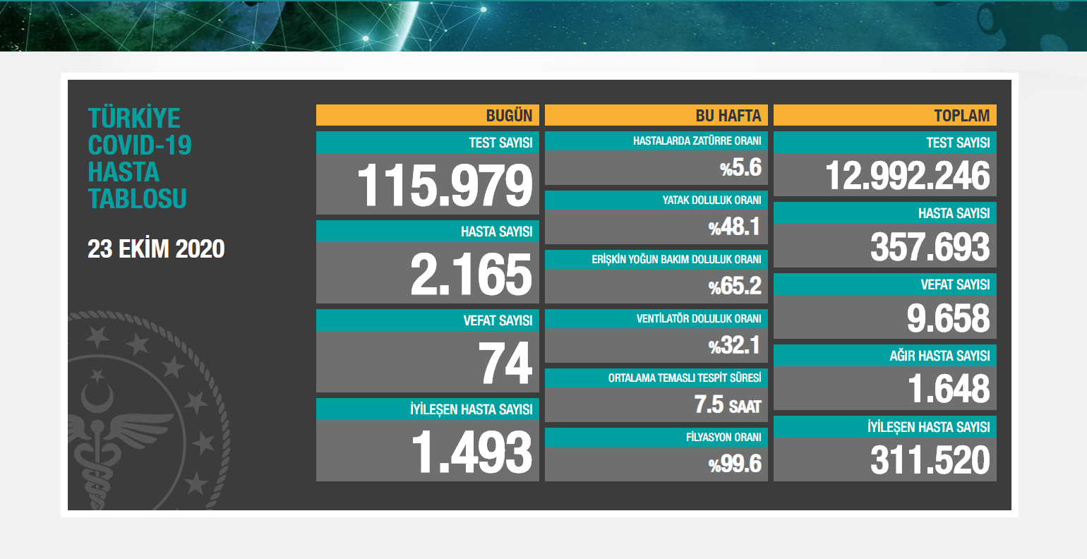 Türkiye’de koronavirüs nedeniyle 74 yurttaş daha yaşamını yitirdi, 2 bin 165 yeni hasta tespit edildi. Böylece toplam vefat sayısı 9 bin 658’e, hasta sayısı ise 357 bin 693’e yükseldi. Ağır hasta sayısı bin 648 olarak açıklanırken, iyileşen sayısı bin 493 oldu. Bugünkü test sayısı 115 bin 979 olurken, toplam iyileşen sayısı 311 bin 520’ye yükseldi.
