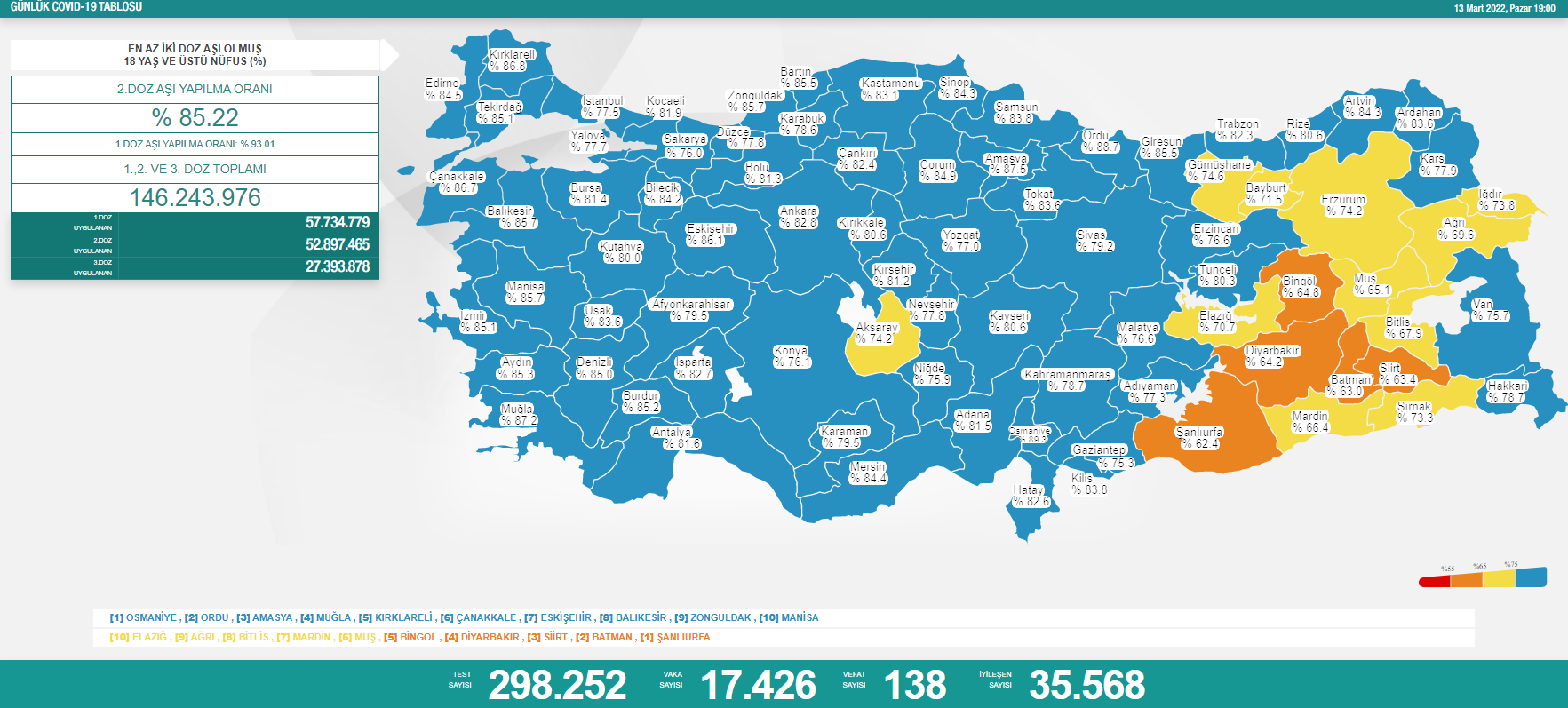 Sağlık Bakanlığı’nın açıkladığı güncel koronavirüs verilerine göre son 24 saatte 298 bin 252 Covid-19 testi yapılırken, 17 bin 426 yeni vaka tespit edildi. 138 kişi salgın nedeniyle hayatını kaybetti. 35 bin 568 kişinin ise iyileştiği bildirildi.