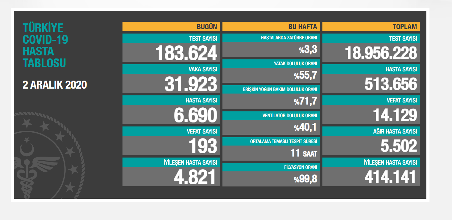 Sağlık Bakanlığı’nın verilerine göre, Türkiye’de koronavirüs nedeniyle 193 kişi daha hayatını kaybetti, 31 bin 923 yeni ‘vaka’ tespit edildi. Böylece toplam vefat sayısı 14 bin 129’a, toplam hasta sayısı ise 513 bin 656’ya yükseldi. Son 24 saatte ağır hasta 5 bin 502, iyileşen hasta 4 bin 821, toplam iyileşen sayısı 414 bin 141 olarak kaydedildi.