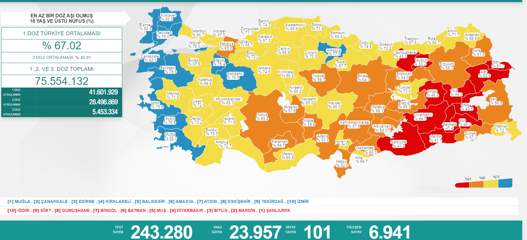 Sağlık Bakanlığı’nın günlük açıkladığı koronavirüs verilere göre son 24 saatte 243 bin 280 test yapıldı ve 23 bin 957 yeni vaka tespit edildi. 101 kişinin koronavirüs sebebiyle hayatını kaybettiği aktarıldı. Tabloya göre iyileşen sayısı 6 bin 941 oldu.