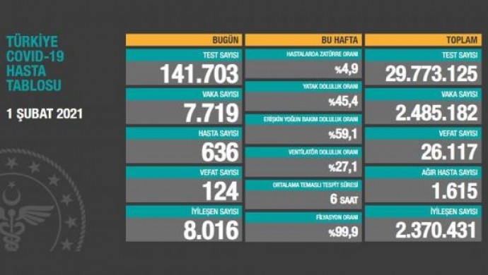 Tabloya göre Türkiye’de Koronavirüs nedeniyle 124 kişi daha hayatını kaybetti, 7 bin 719 yeni vaka tespit edildi. Böylece pandemiden dolayı yaşamını yitiren toplam kişi sayısı 26 bin 117’ye, vaka sayısı ise 2 milyon 485 bin 182’ye yükseldi.