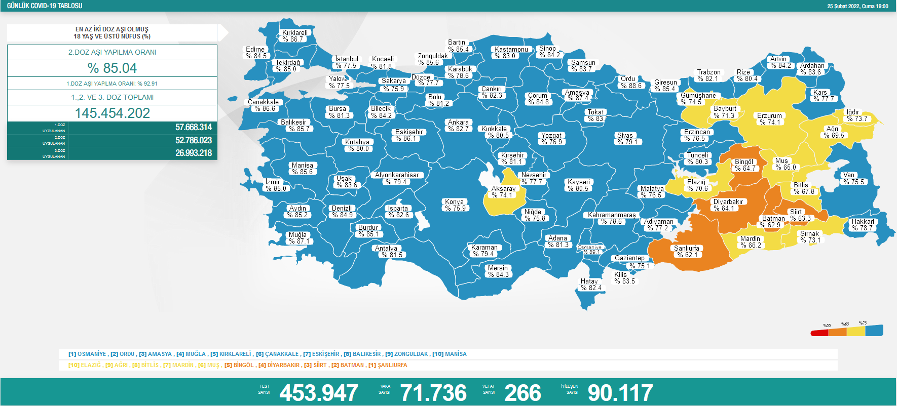 Sağlık Bakanlığı’nın günlük açıkladığı koronavirüs verilere göre son 24 saatte 453 bin 947 test yapıldı ve 71 bin 736 yeni vaka tespit edildi. 266 kişinin koronavirüs sebebiyle hayatını kaybettiği belirtildi.