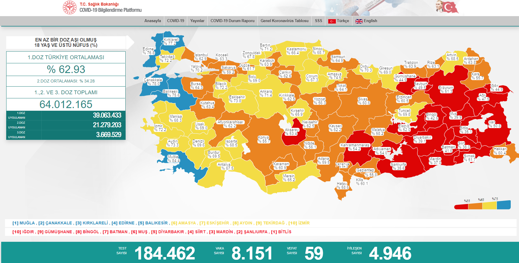 Sağlık Bakanlığı’nın günlük açıkladığı koronavirüs verilere göre son 24 saatte 184 bin 462 test yapıldı ve 8 bin 151 yeni vaka tespit edildi. 59 kişinin koronavirüs sebebiyle hayatını kaybettiği belirtildi. Son 24 saatte iyileşen sayısı 4 bin 946 olarak açıklandı.