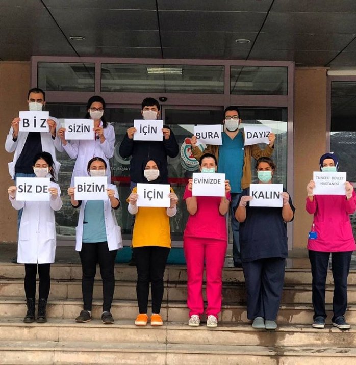 Ayrıca, Tunceli Devlet Hastanesi çalışanları da ‘Biz sizin için buradayız, siz de bizim için evinizde kalın’ yazılı dövizlerle halka çağrı yaptı.