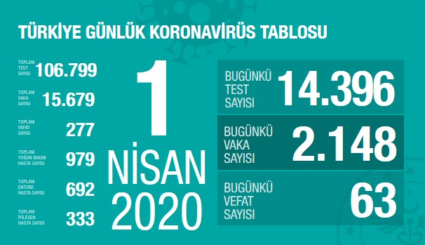 PİRHA – Sağlık Bakanlığınca, son 24 saatte 2 bin 148 kişiye koronavirüs tanısı konulduğu, 63 kişinin daha hayatını kaybettiği, toplam vaka sayısının  15 bin 679’a, can kaybının ise 277’ye ulaştığı bildirildi.
