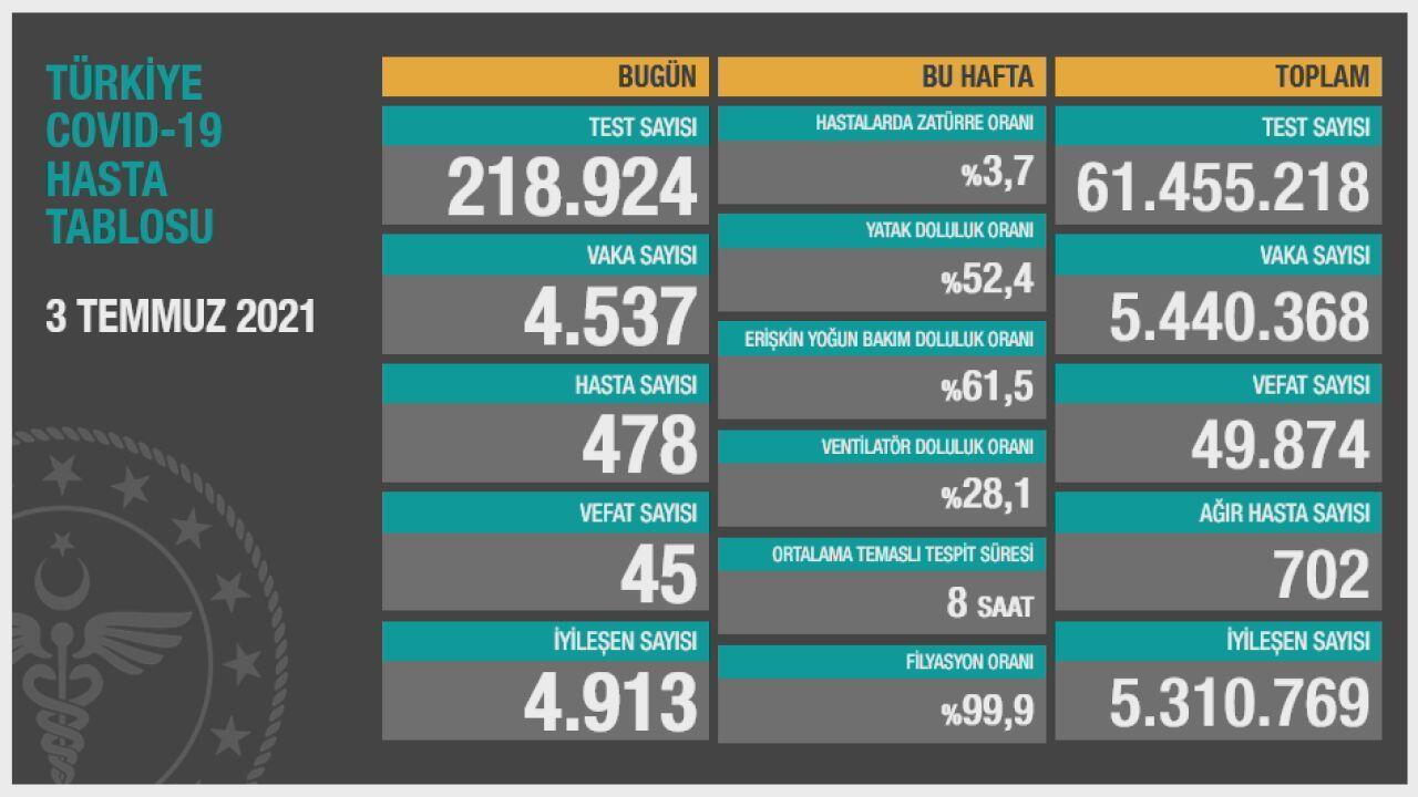 Koronavirüs tablosu açıklandı: 45 can kaybı, 4 bin 537 yeni vaka
