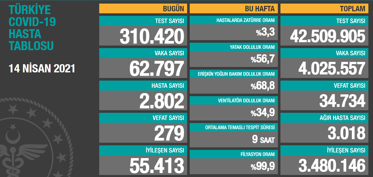 Ağır hasta sayısı 3 bin 18 olurken, 55 bin 413 kişinin de iyileştiğini açıklayan Sağlık Bakanlığı, bugün 310 bin 420 test yapıldığını bildirdi.