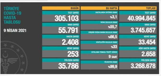 Covid-19 salgını gün geçtikçe etkisini arttırıyor. Sağlık Bakanlığı’nın aktardığı verilere göre Türkiye’de son 24 saatte 305 bin 103 Covid-19 testi yapıldı, 55 bin 791 kişinin testi pozitif çıktı, 253 kişi ise hayatını kaybetti.