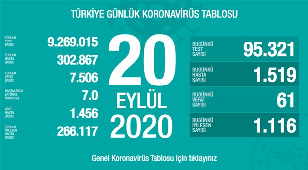 Türkiye’de son 24 saatte 1519 kişiye hastalık tanısı konuldu, 61 kişi vefat etti. Sağlık Bakanı Fahrettin Koca “Bugün ağır hasta sayımız 1.456’ya ulaştı. Artış hızı yavaşlamış olsa da bu sayı azalmadan huzurlu olamayız” dedi.